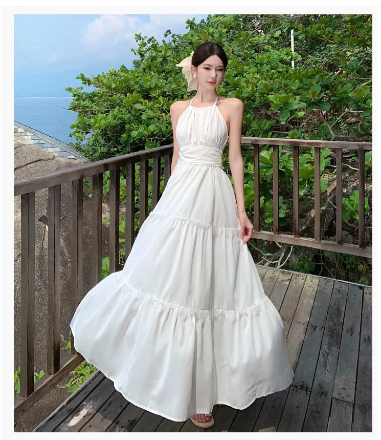 無袖高腰綁帶露背牛仔洋裝|圓領拉鍊休閒長洋裝 夏季顯瘦高街風穿搭