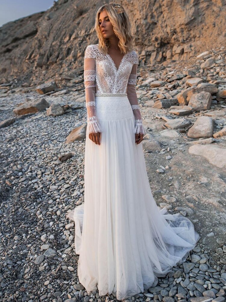波西米亞婚紗/ V 領長袖蕾絲貼花夢幻新娘禮服/波西米亞 A 字公主禮服/大碼