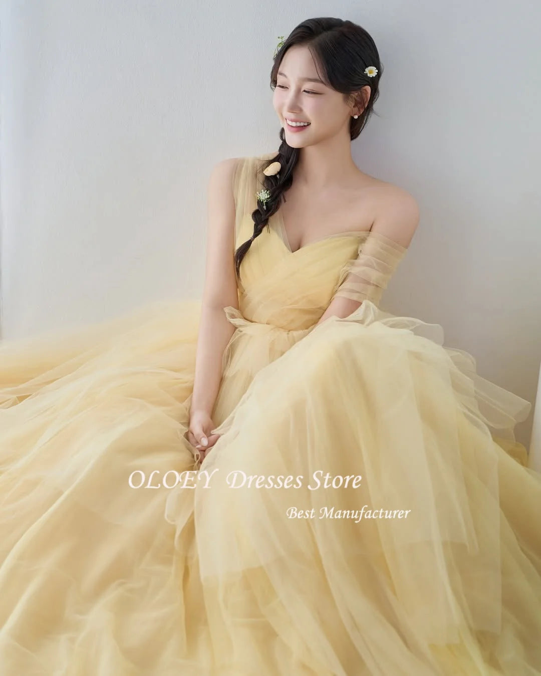 客製韓系禮服|黃色一字肩多層紗長洋裝|婚紗攝影/宴會/高級訂製款