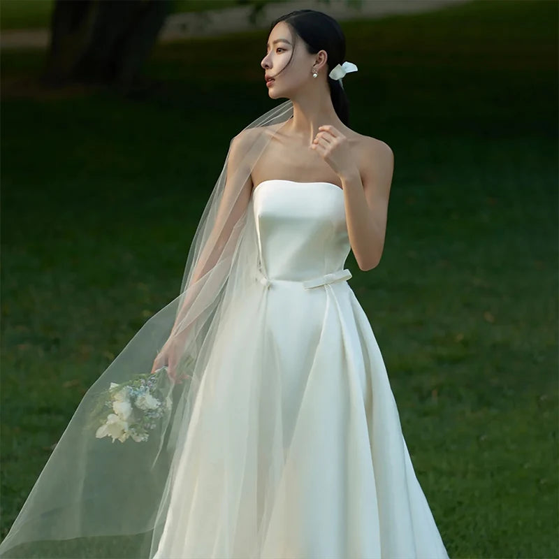 新娘奢華白色緞面雪紡無肩帶婚紗/拖擺禮服/優雅長款舞會晚宴女裝