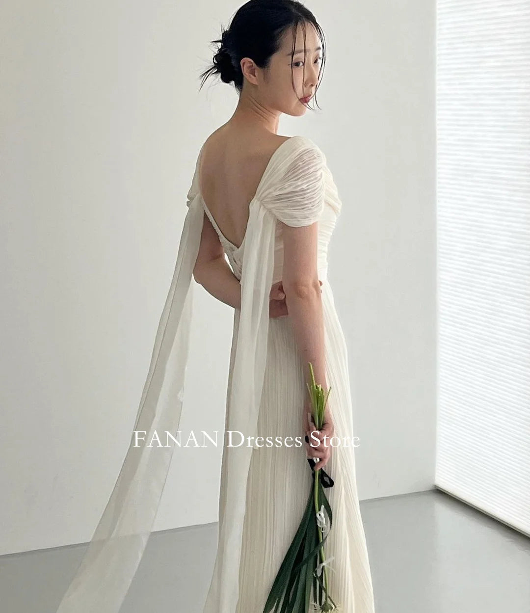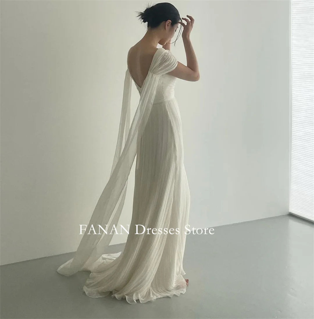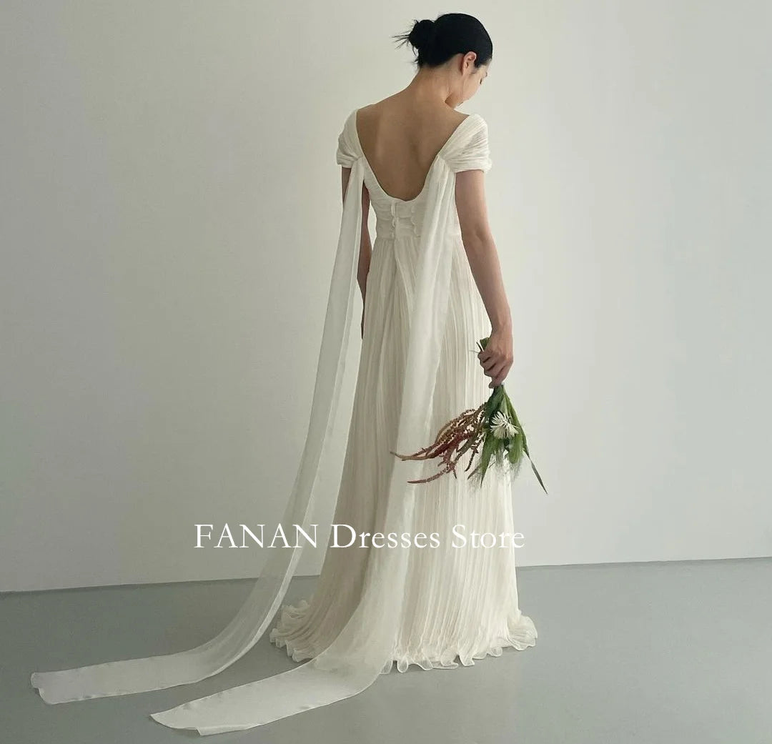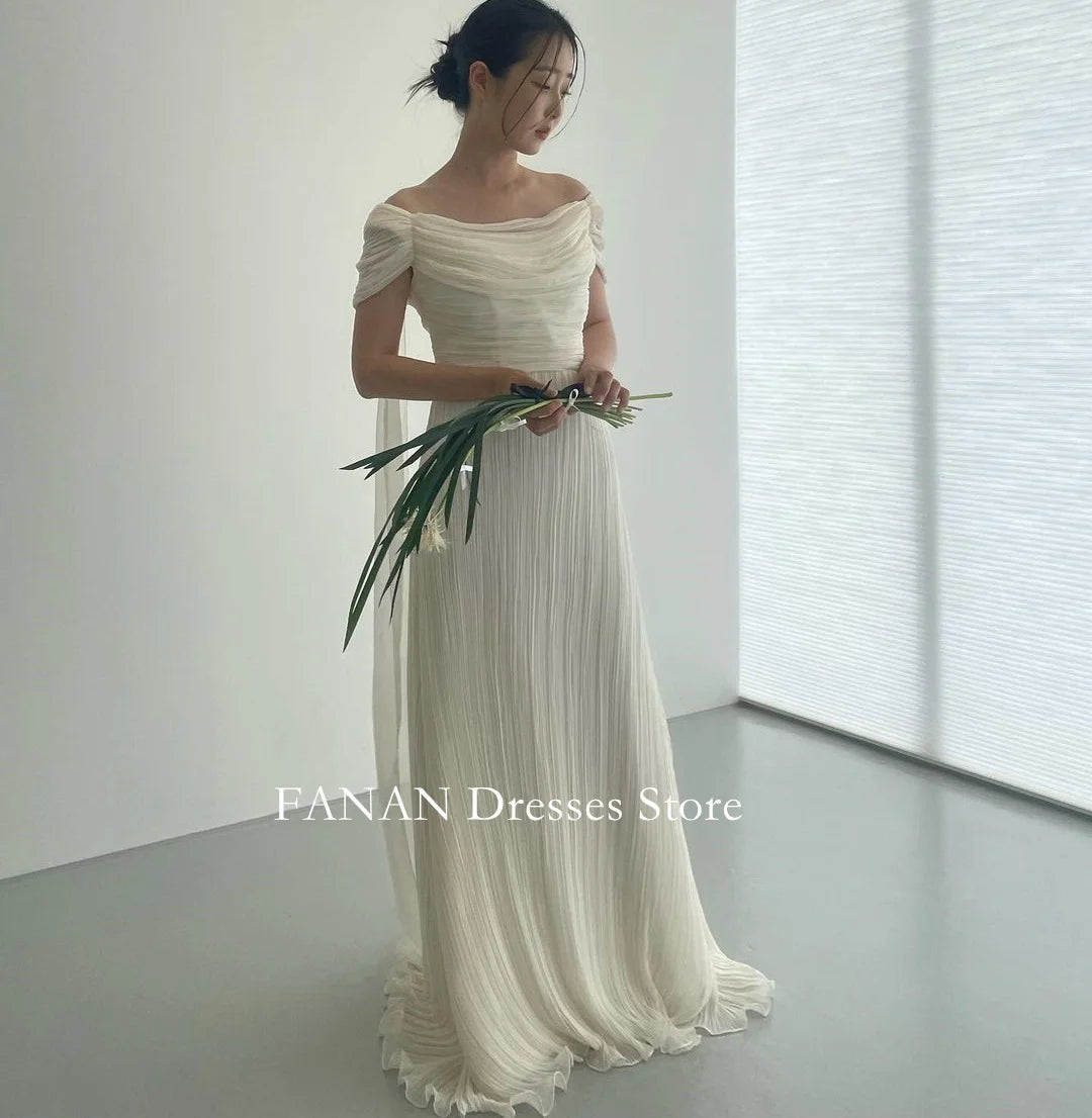 簡約一字肩雪紡婚紗|露背設計 × 壓褶裙襬 × 可客製尺寸與顏色|刷地小拖尾款