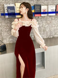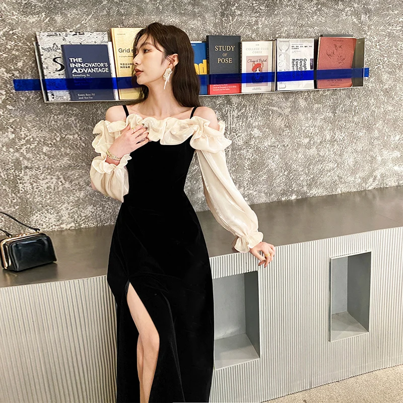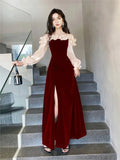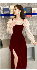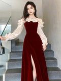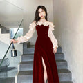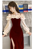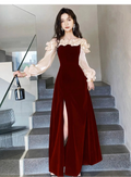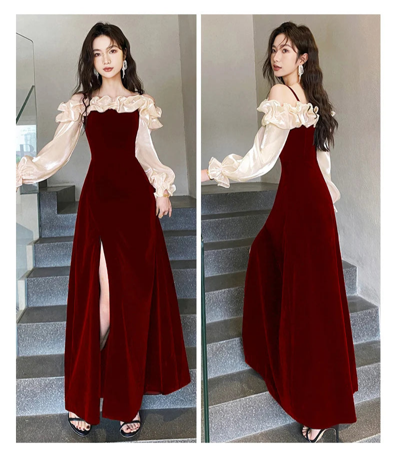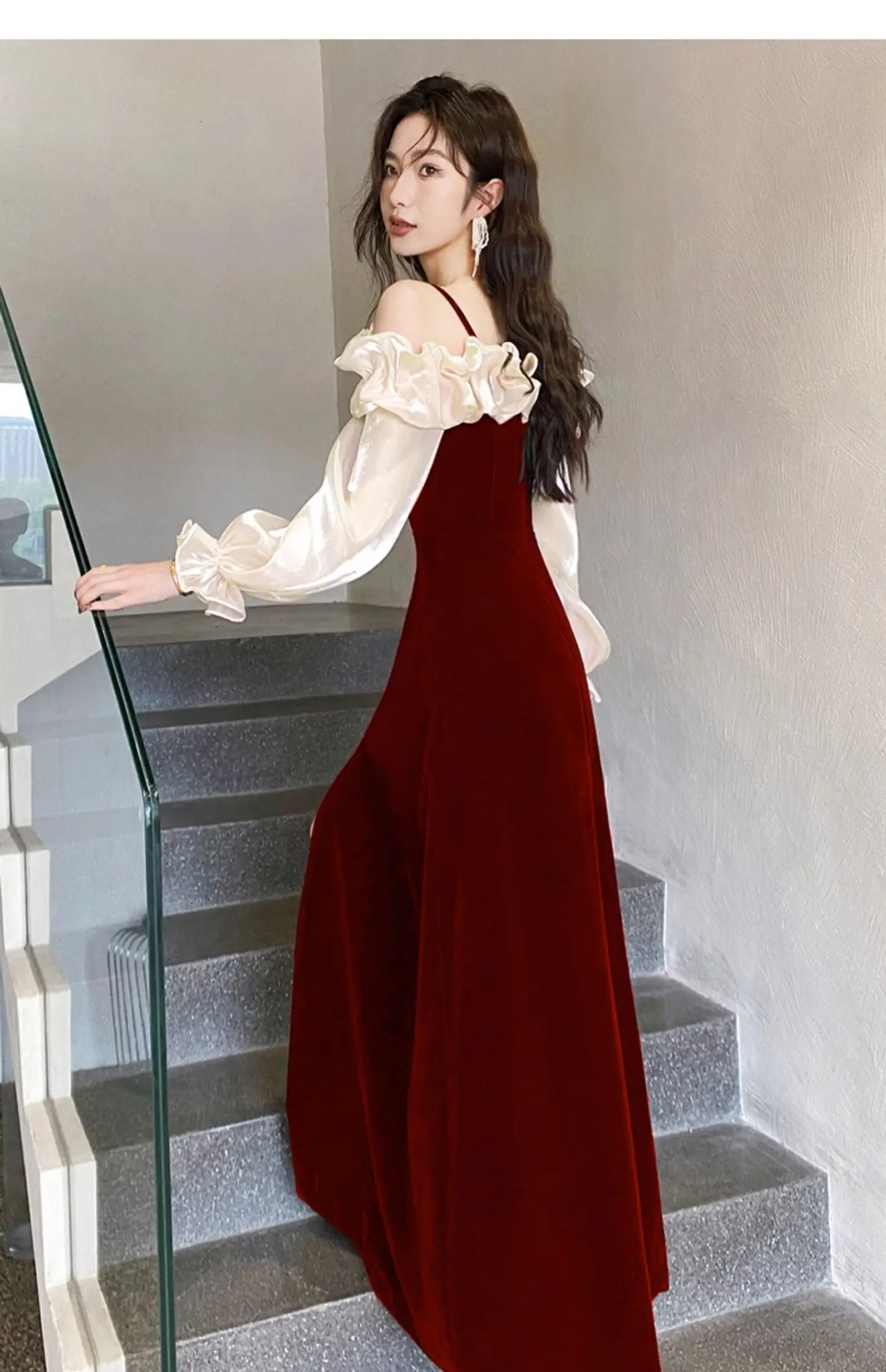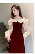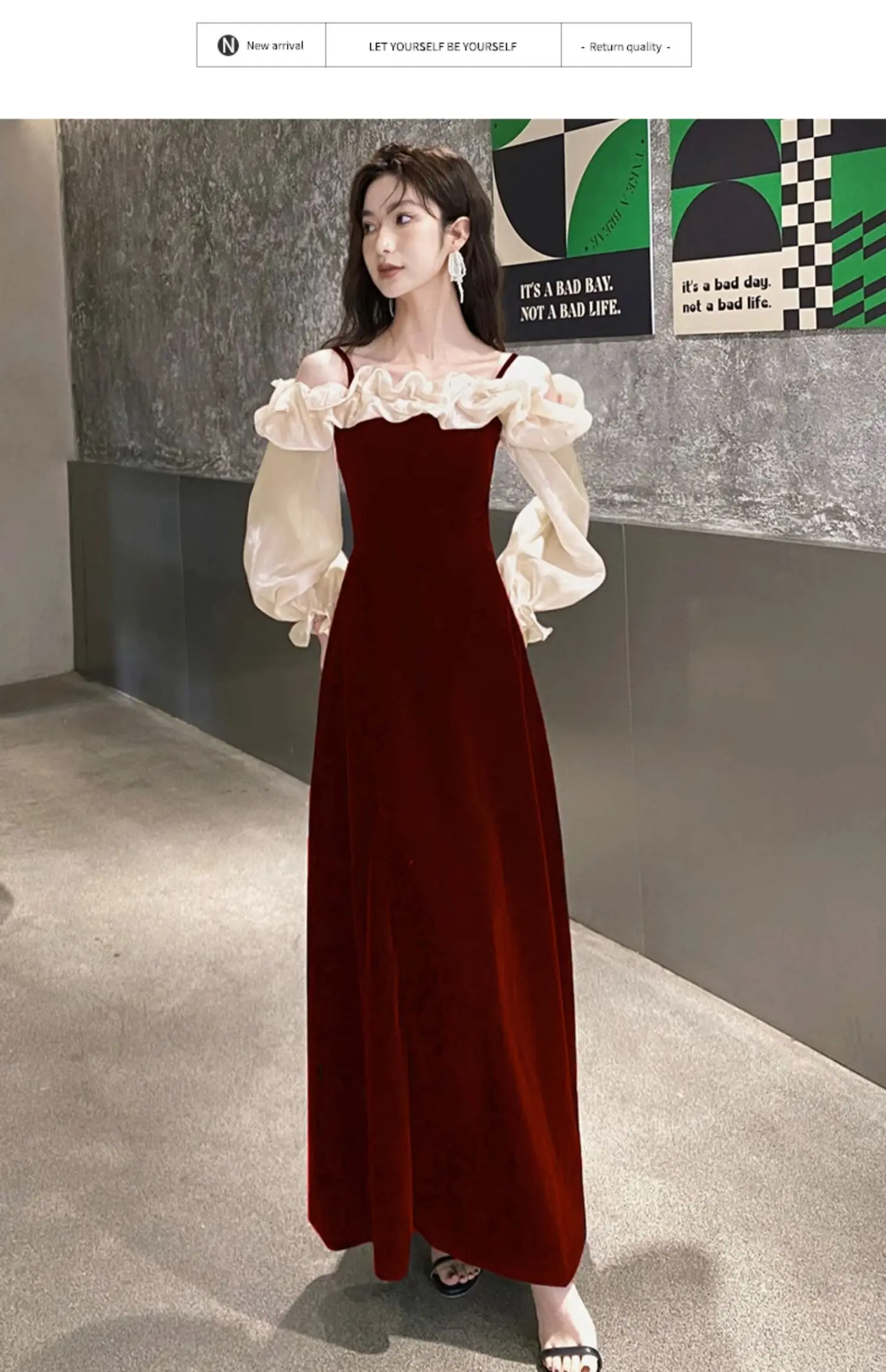 此款優雅紅色洋裝以復古風格為設計核心,採用一字領搭配蓬蓬袖與荷葉邊裝飾,展現出女性的浪漫與典雅。適合參加婚禮、晚宴、派對、舞會等場合,是您衣櫃中不可或缺的宴會戰袍。