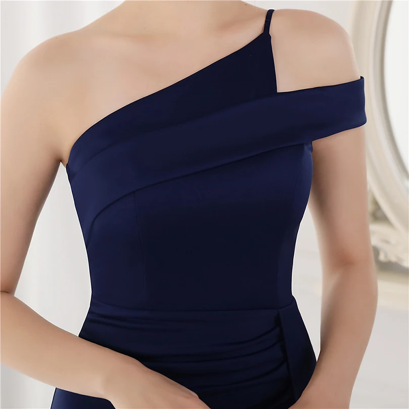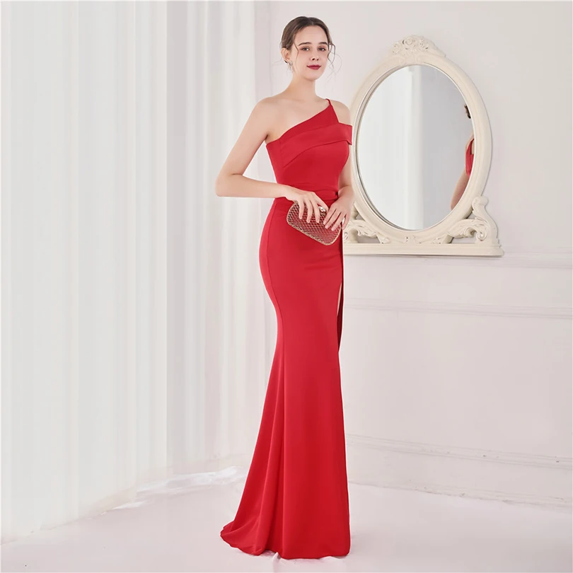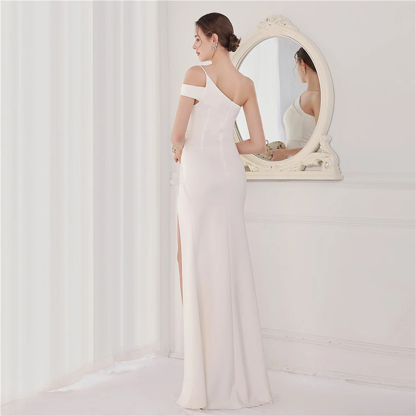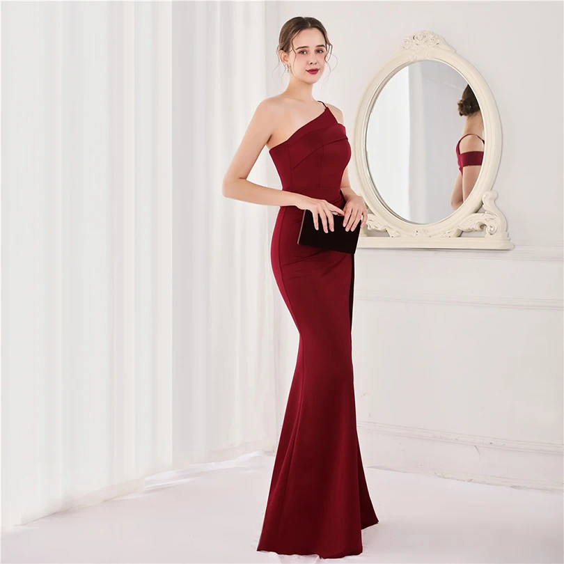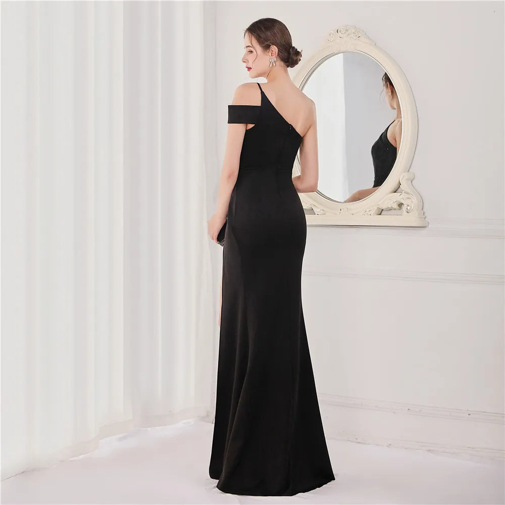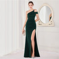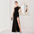 經典晚禮服系列,採用單肩削肩剪裁搭配魚尾裙襬設計,散發極致女性魅力。無袖設計與貼身剪裁完美勾勒身形曲線,展現典雅中帶點性感氛圍,特別適合參加各類正式晚宴、派對與畢業舞會。