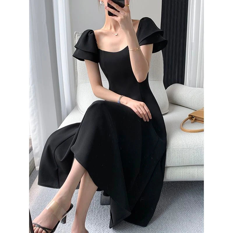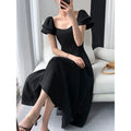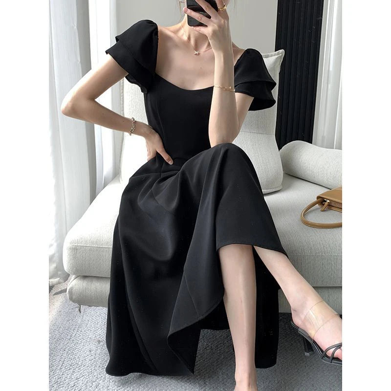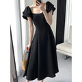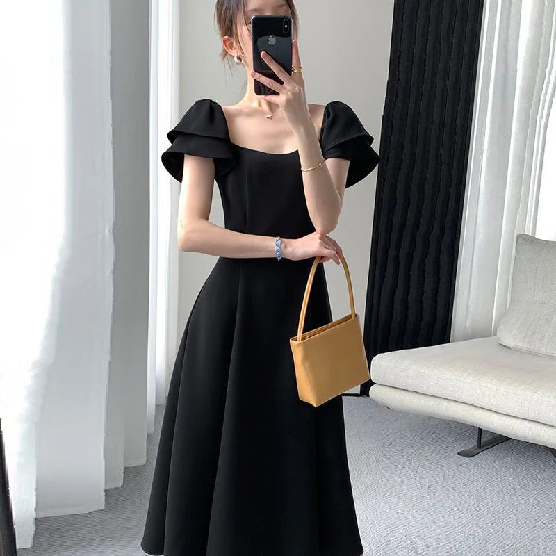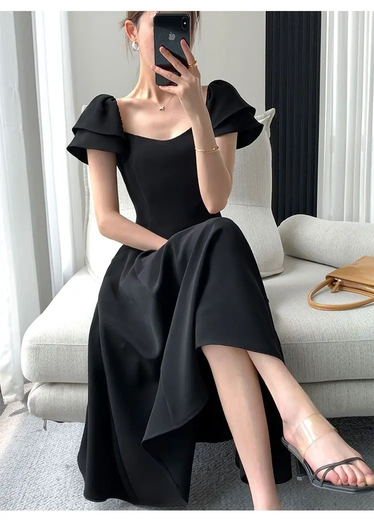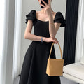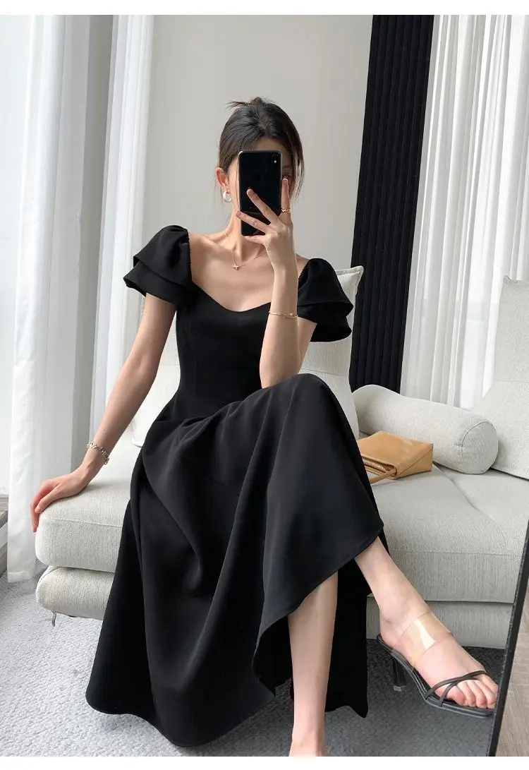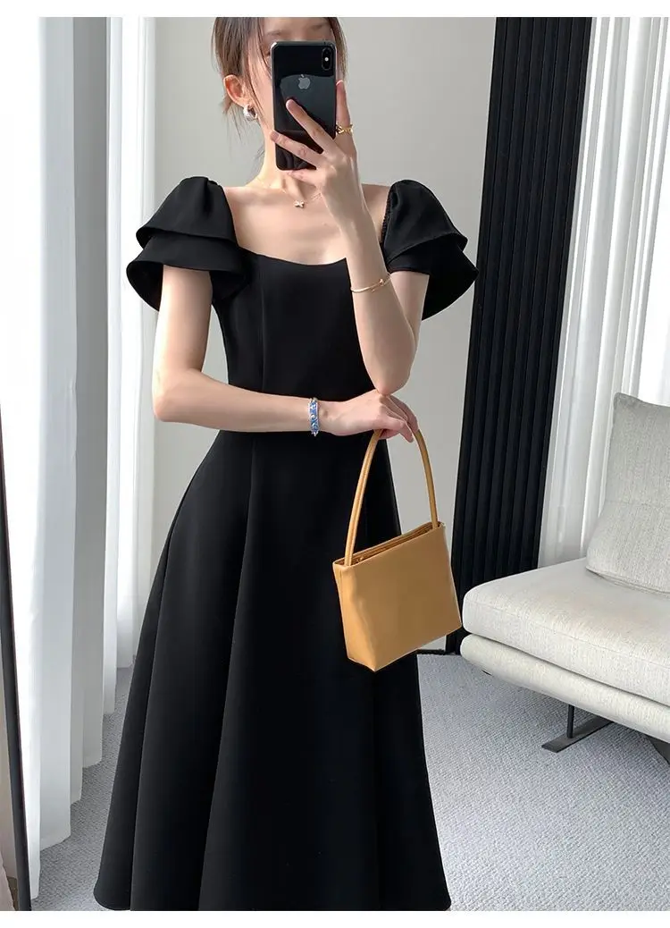 此款夏季學院風洋裝採方領設計,短袖搭配抓皺腰身,修飾身形曲線。整體剪裁為高腰A字裙型,裙長約至小腿中段,適合日常穿搭、上班、約會等多場合使用。以棉混紡布料製作,無彈性,穿著俐落有型。