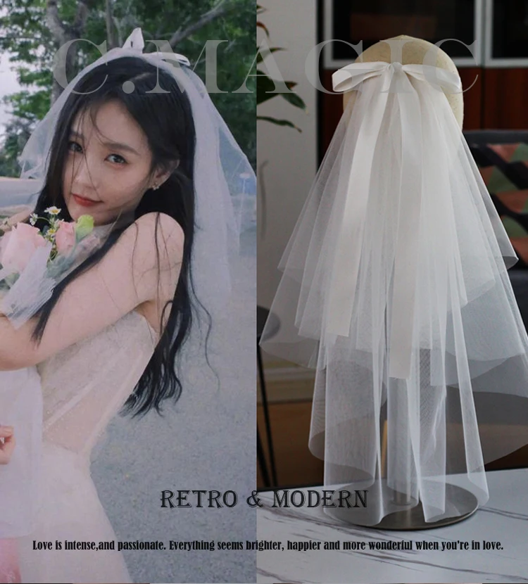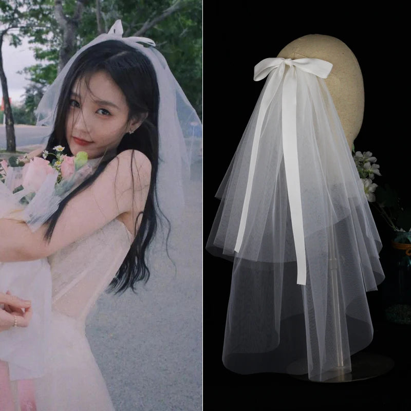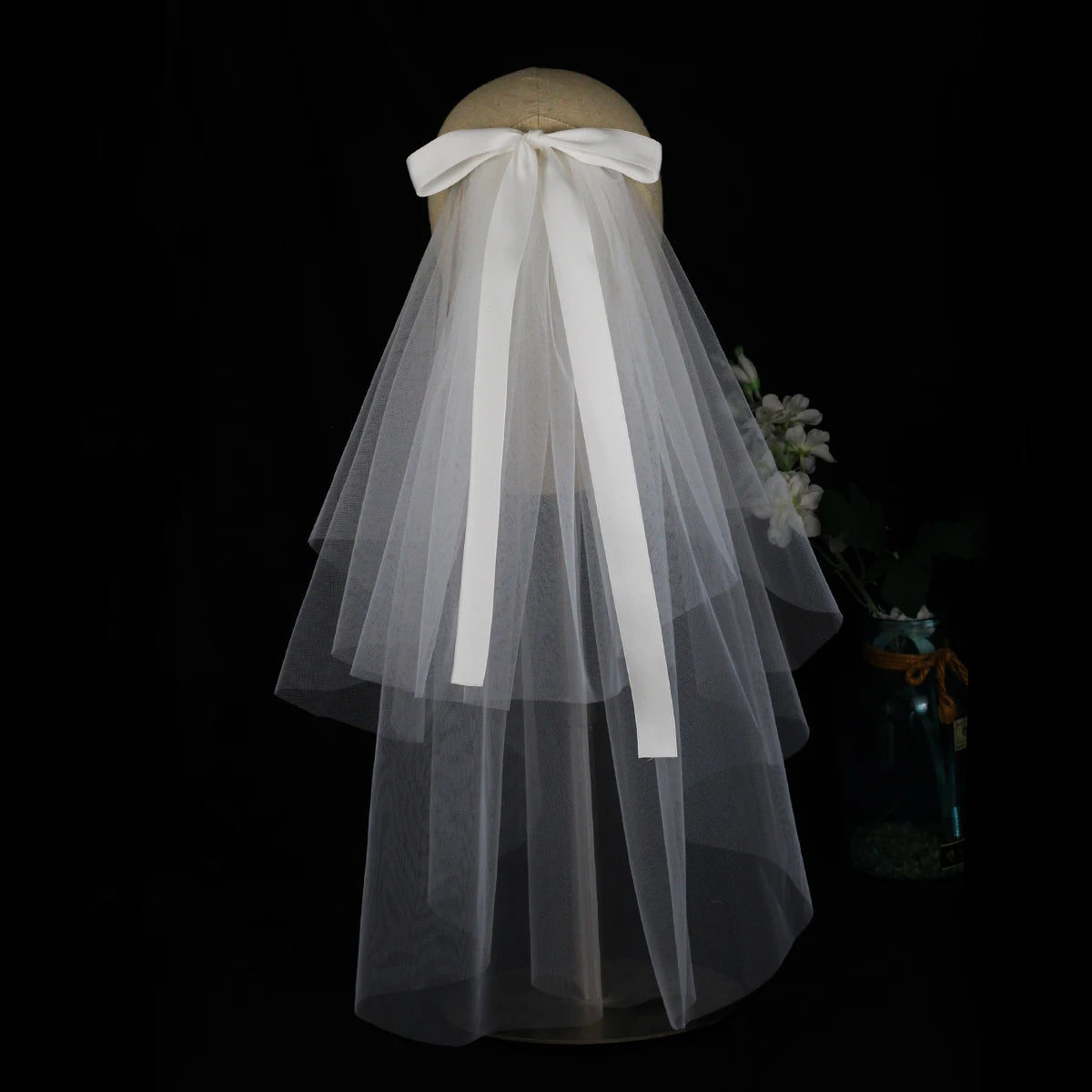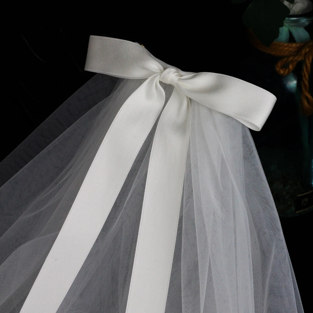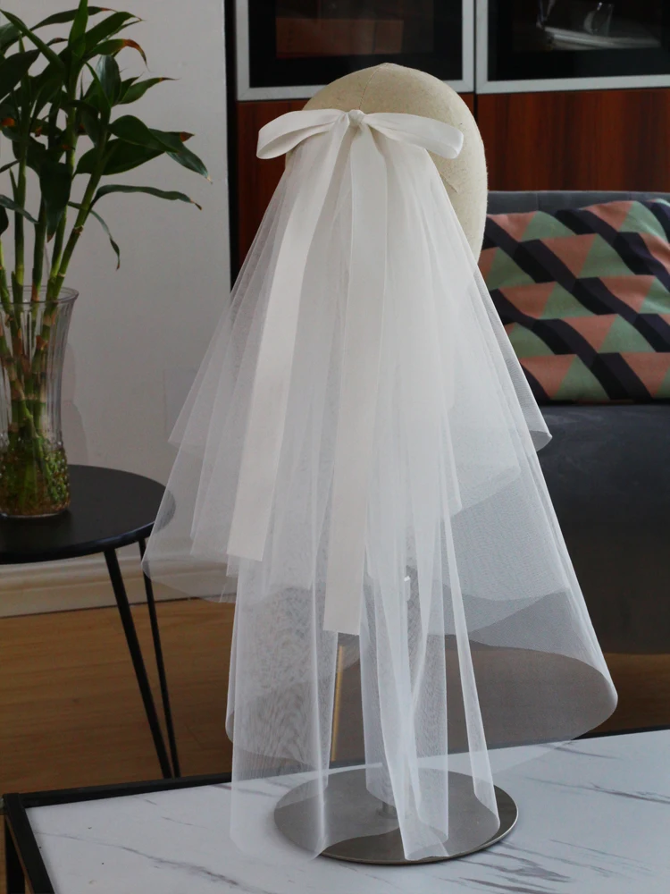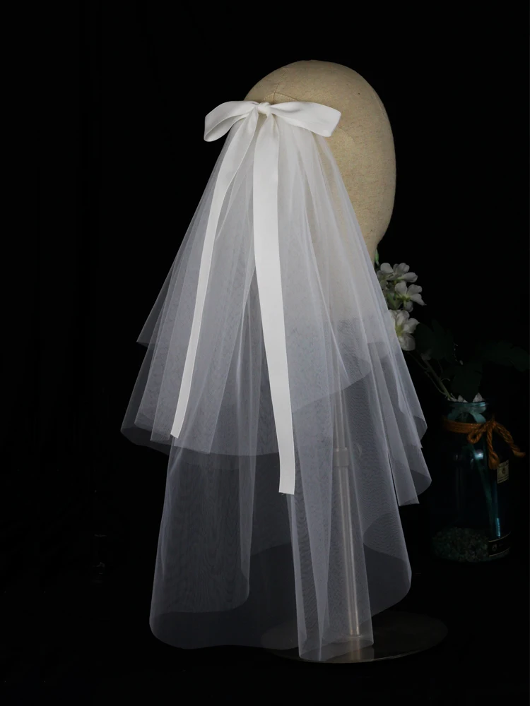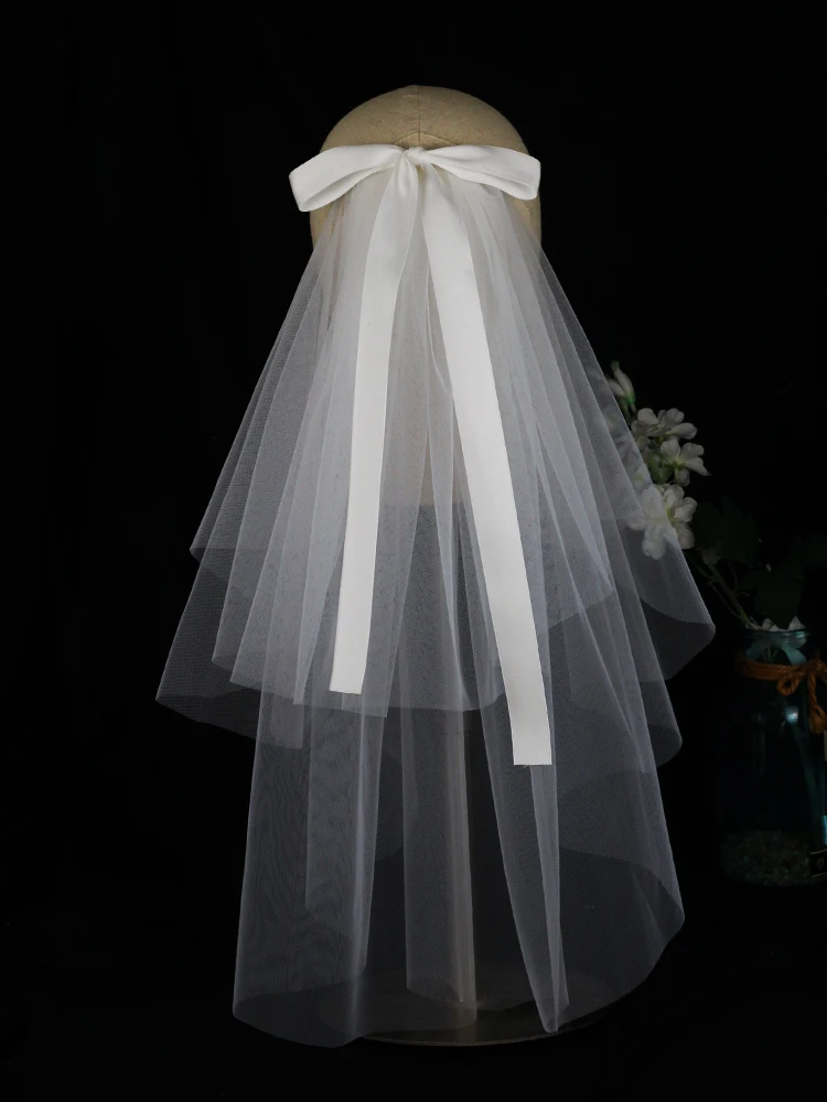歐美風緞帶蝴蝶結雙層新娘頭紗(肩長)