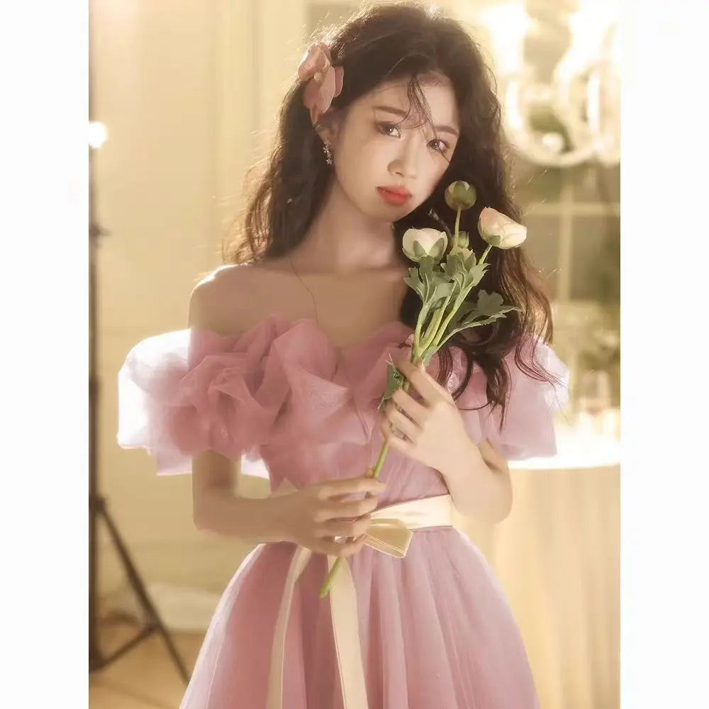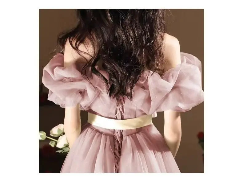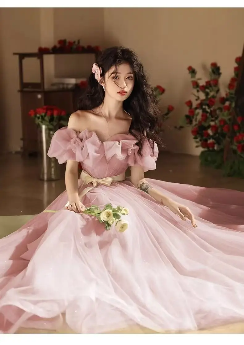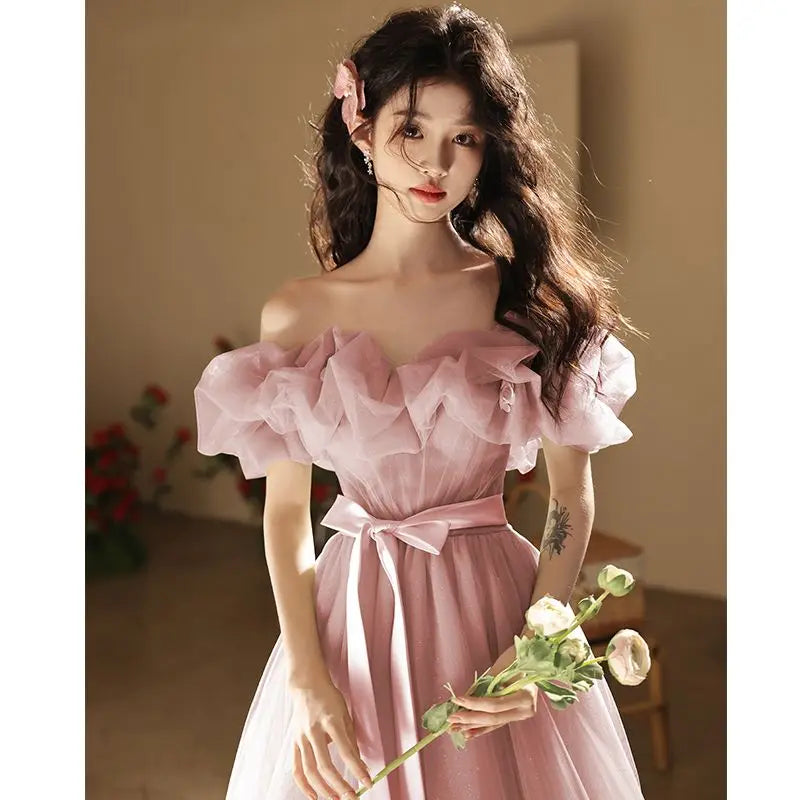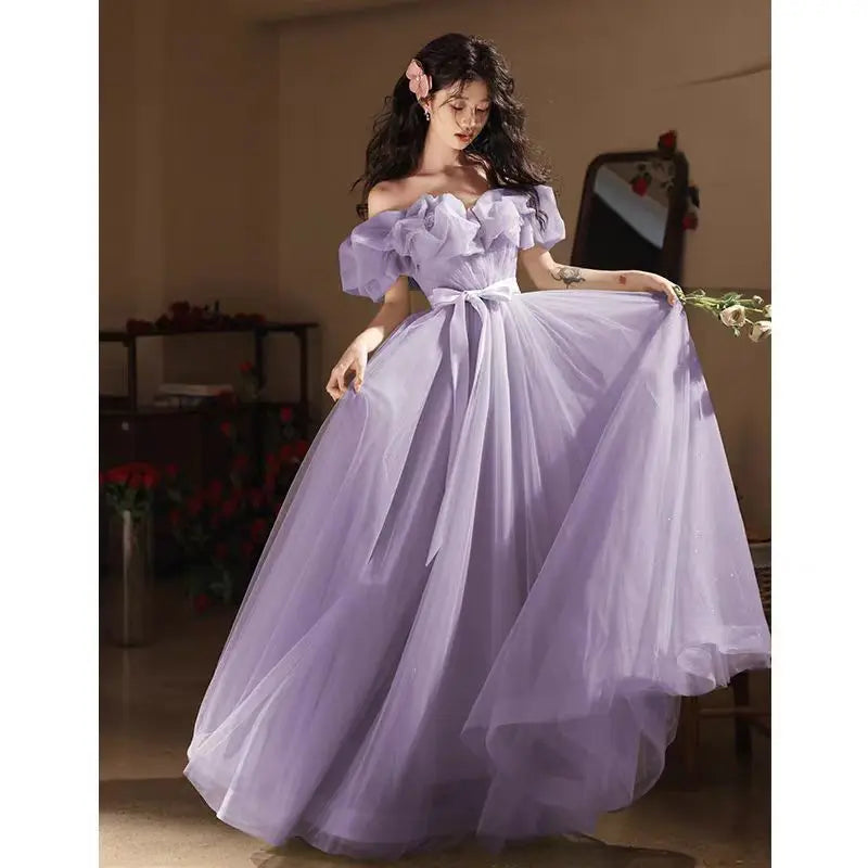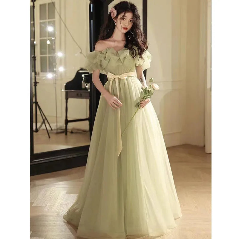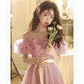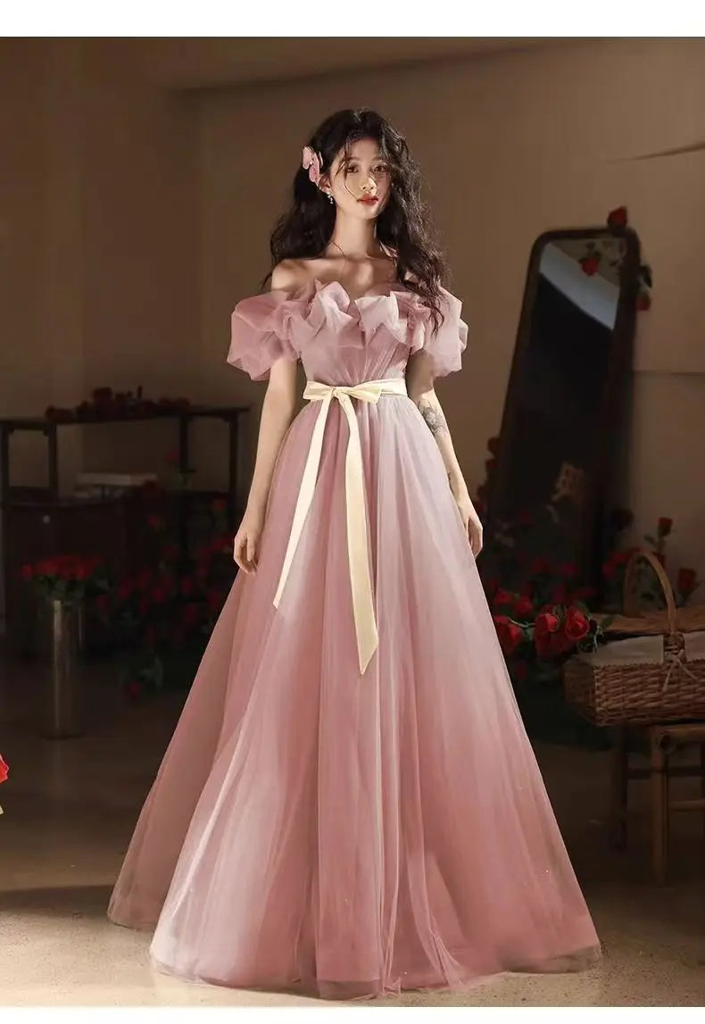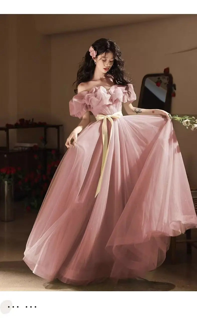 這款露肩禮服以輕盈柔和的糖果染色調為特色,結合經典 A 字裙擺與抓皺細節設計,展現溫柔浪漫的氣質。高腰線設計能有效拉長身形比例,搭配內建胸墊,穿著更顯穩定與舒適。非常適合出席畢業舞會、婚禮賓客場合或正式晚宴穿著。