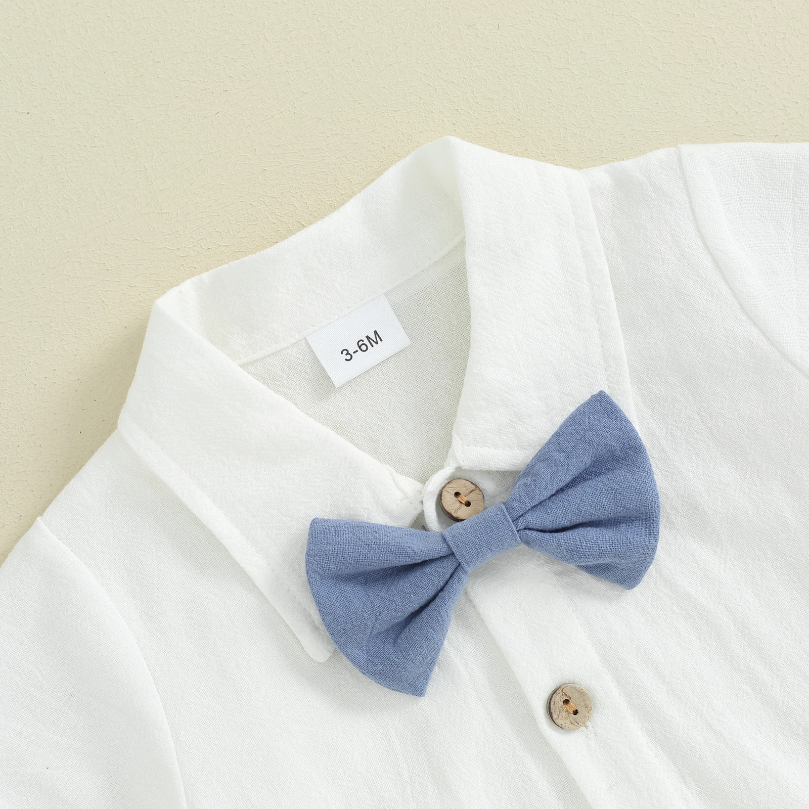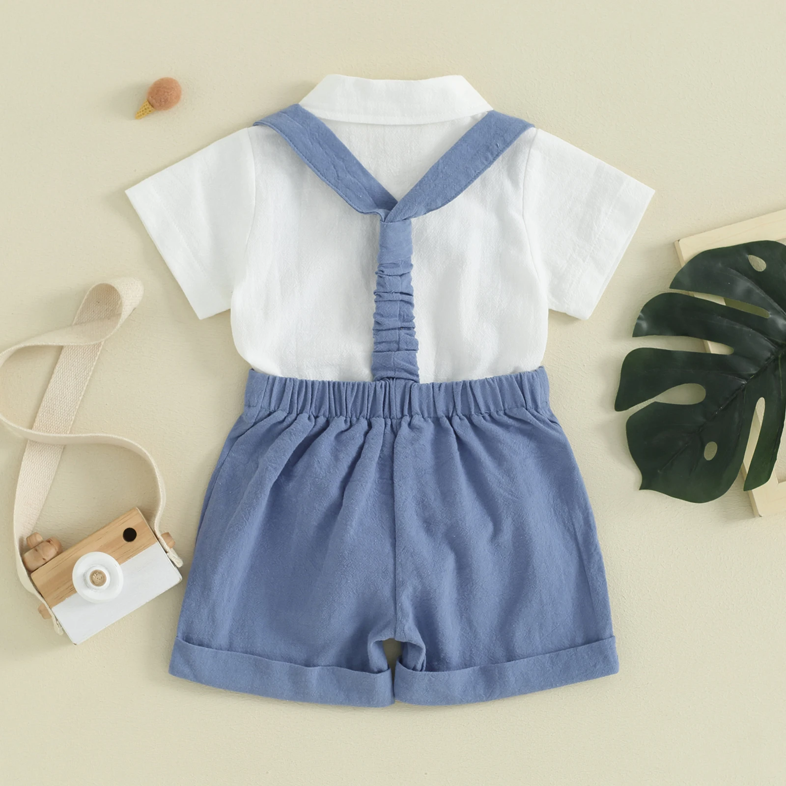 ,帶領結和工裝短褲套裝,適合正式穿著。幼兒背帶褲配有可調式扣環肩帶,確保舒適貼合,非常適合日常穿著。