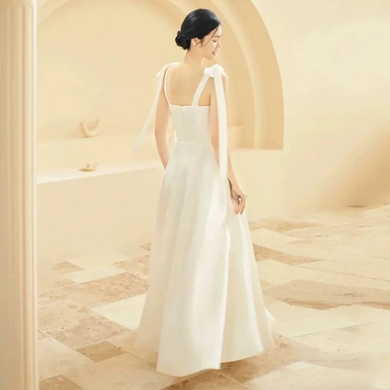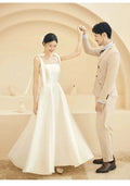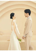 這款長禮服專為追求法式復古氣質和現代簡約風格的新娘設計,採用A-Line 裙擺並貼心地內建胸墊。其流暢的線條和經典的吊帶設計,完美體現 Less is More 的優雅哲學。它既能作為輕婚紗用於登記或小型儀式,也適合在盛大的晚宴中作為第二套禮服或伴娘禮服。