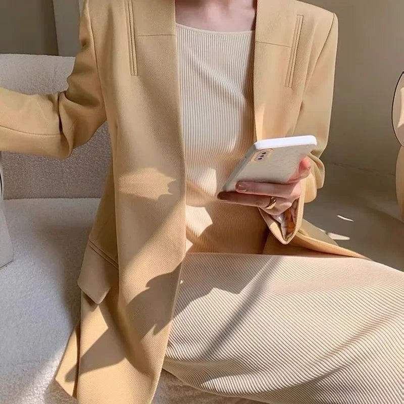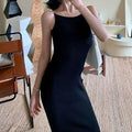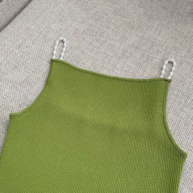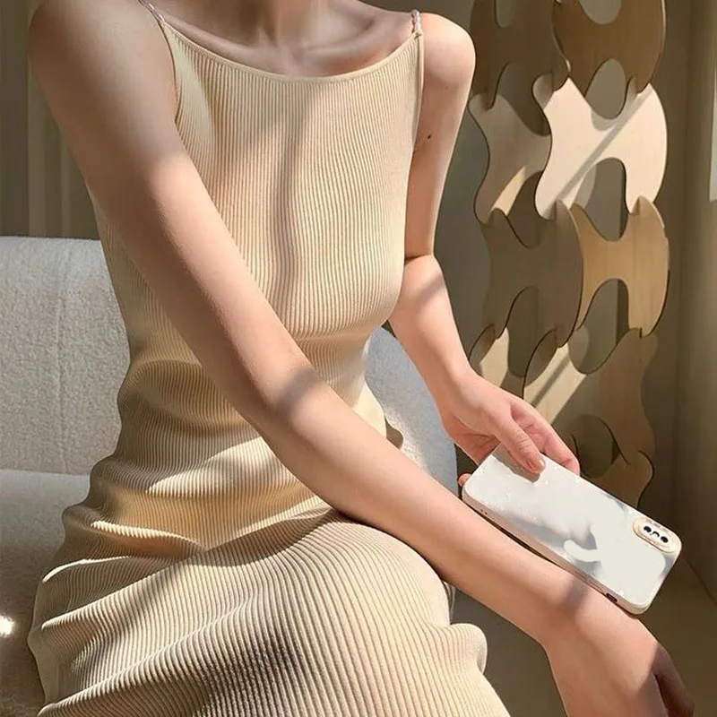簡約俐落的羅紋針織洋裝,搭配細肩帶與露背設計,展現修身線條。適合春夏穿搭,可搭配披肩或外套應對多種場合。提供杏色、綠色、黑色三色選擇。