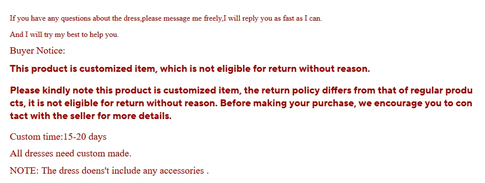 - 因婚紗/禮服製作工時較長,約3-4週,實際運送時間請依照貨運安排以及報關情況為主,若有緊急或特殊需求請聯繫客服。