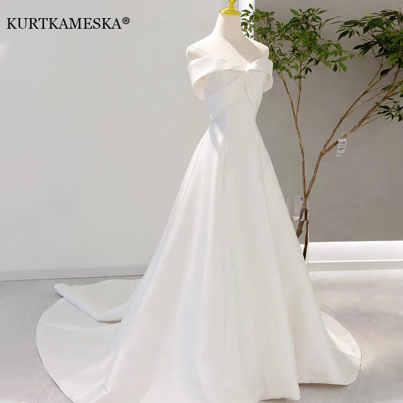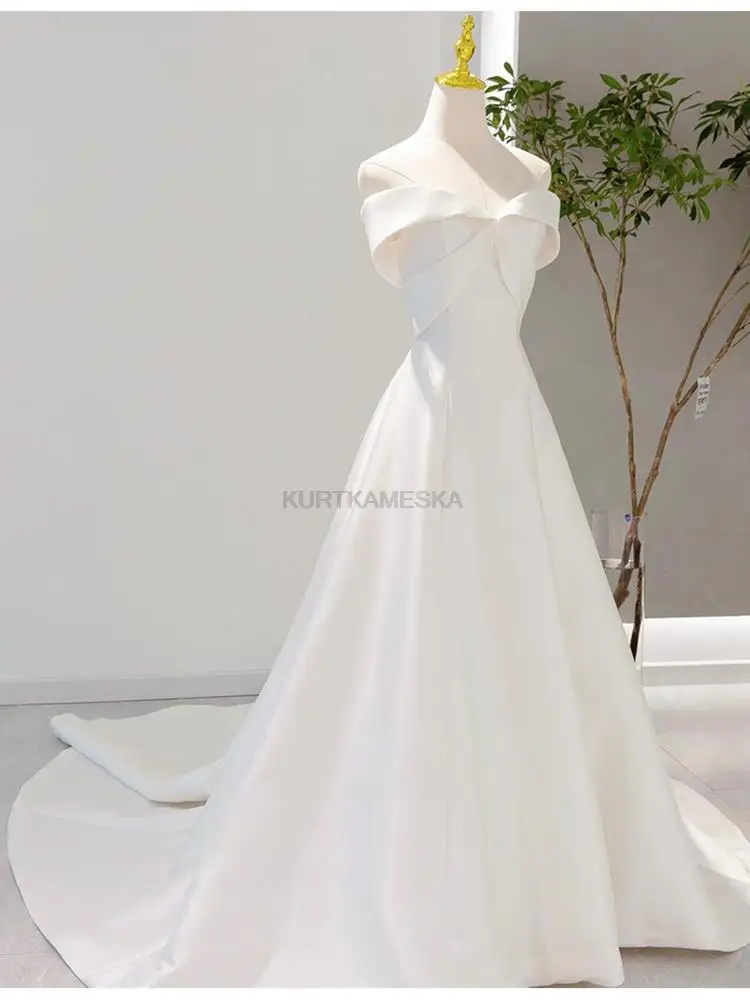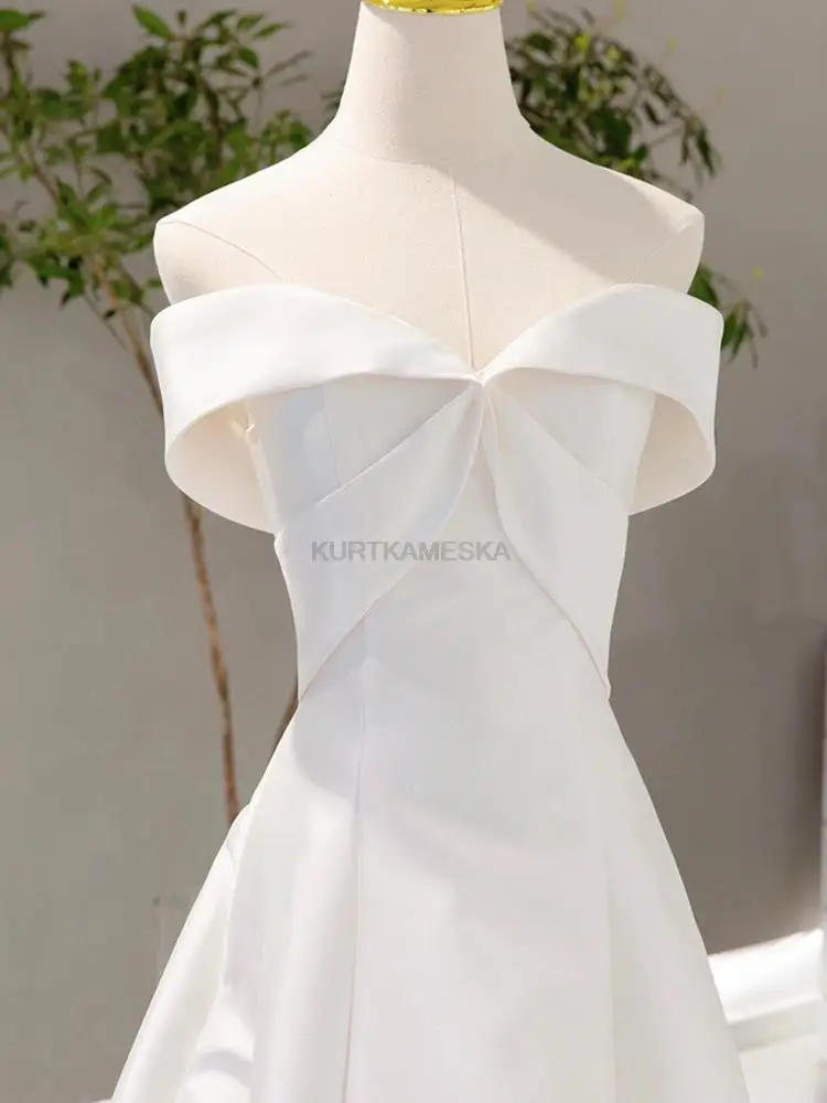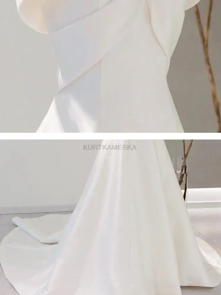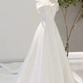 採用經典無肩設計,展現頸肩線條,結合緞面布料的柔滑光澤,營造純淨又高貴的婚禮氛圍。 -
