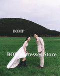 此款婚紗採用天然面料與經典蕾絲綁帶設計,前短後長的裙擺展現俏皮中不失正式感,內建胸墊無需另穿內衣,特別適合懷孕新娘或喜歡自然風格的女性。