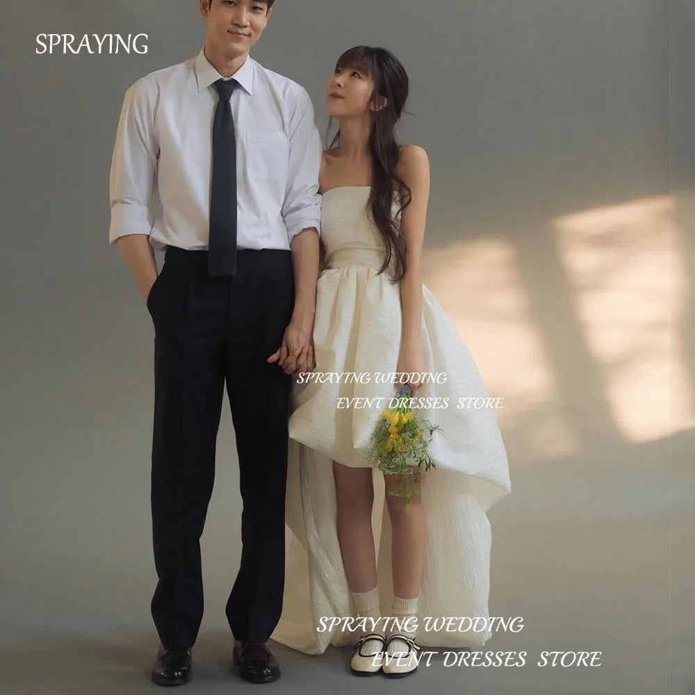 此款為客製化婚紗,採用高低擺設計,適合婚禮、拍照、晚宴等多種場合。無袖平口剪裁,後背綁帶設計,內附胸墊。採用塔夫綢布料製作,可根據個人尺寸訂製,亦可適用孕婦身形。