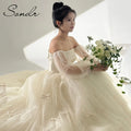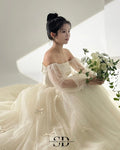 這款韓系輕婚紗是為您的擔憂提供的完美解方。它採用經典的 A-Line 剪裁,並結合泡泡袖(可拆卸或設計)元素,讓您在保持優雅復古風格的同時,行動依然輕盈自在。