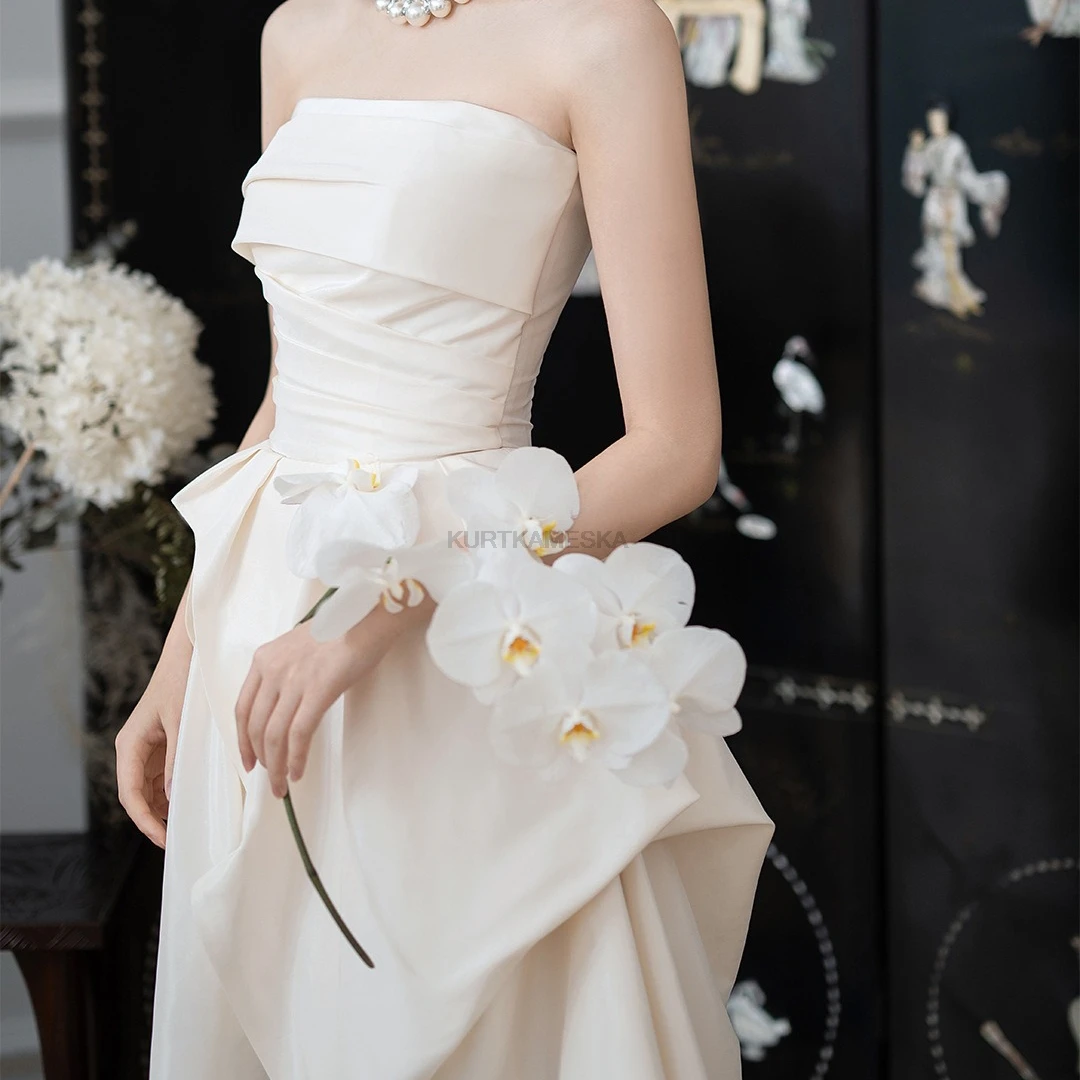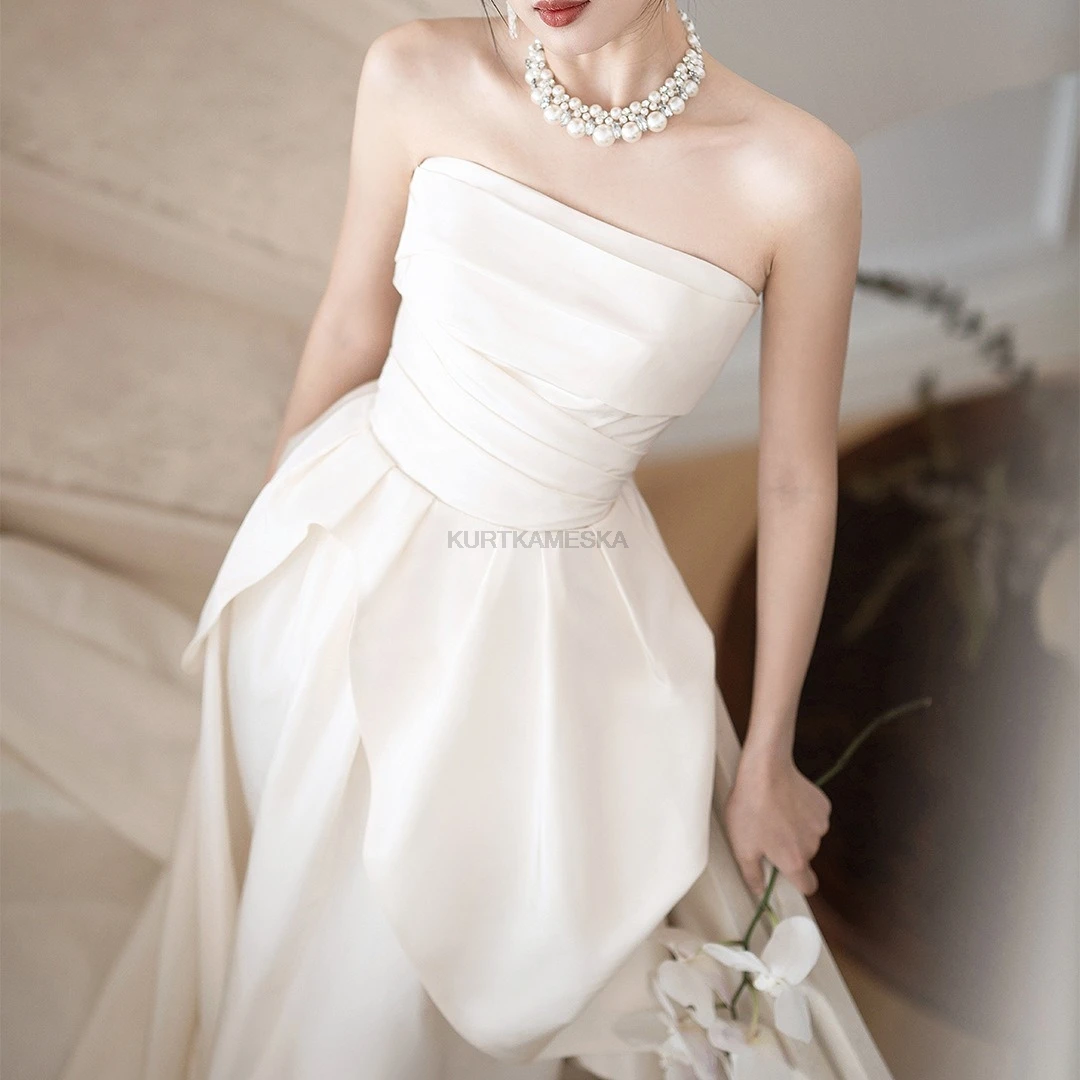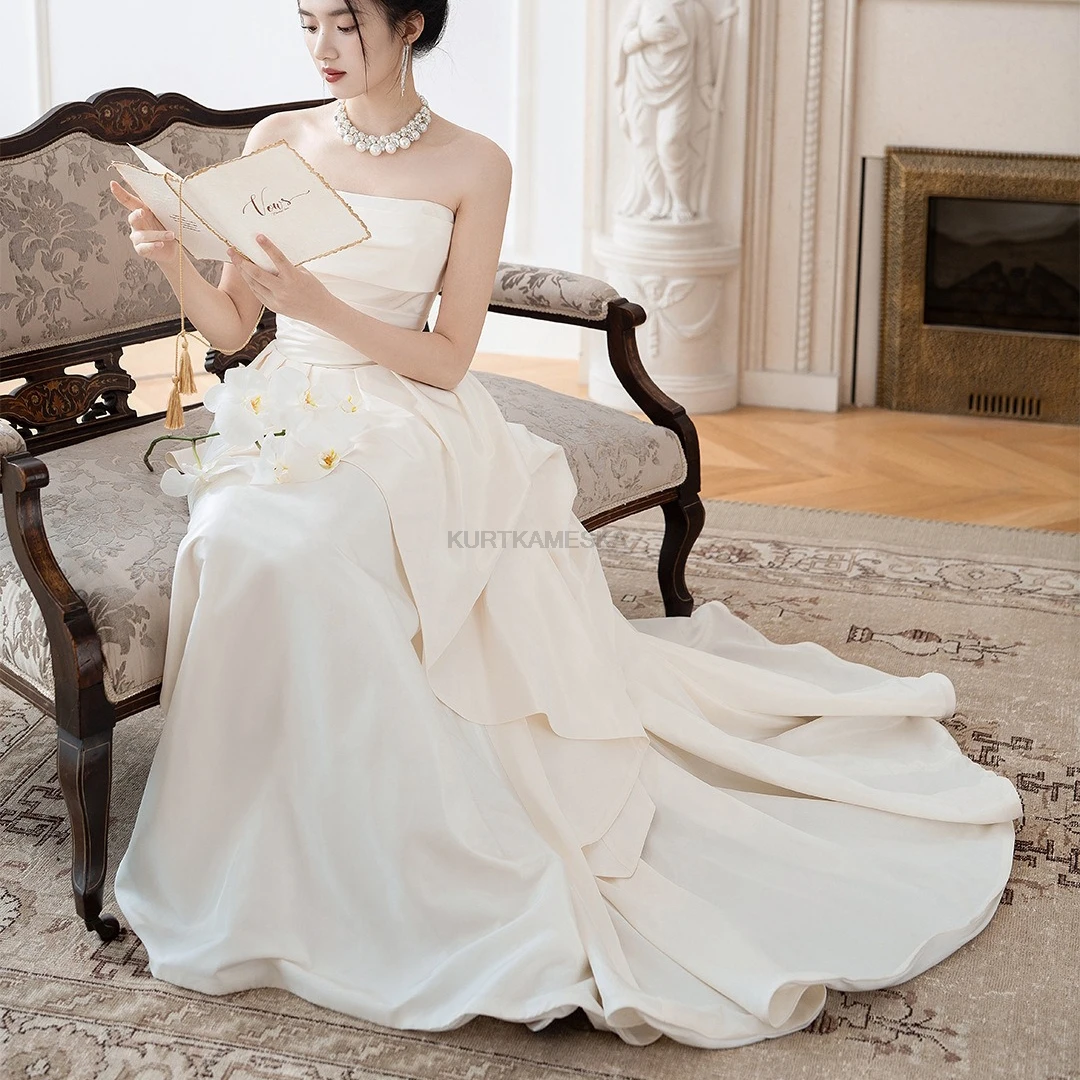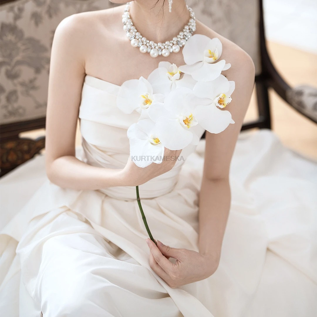 量身打造,展現自然身形 採用親膚的緞面布料(Satin),搭配簡約的平口露背與後綁帶設計,不僅修飾腰線,更增添美背視覺重點。這款禮服強調移動輕盈、穿脫方便,非常適合海外婚紗拍攝或自助婚紗攝影。