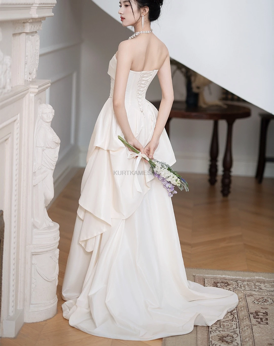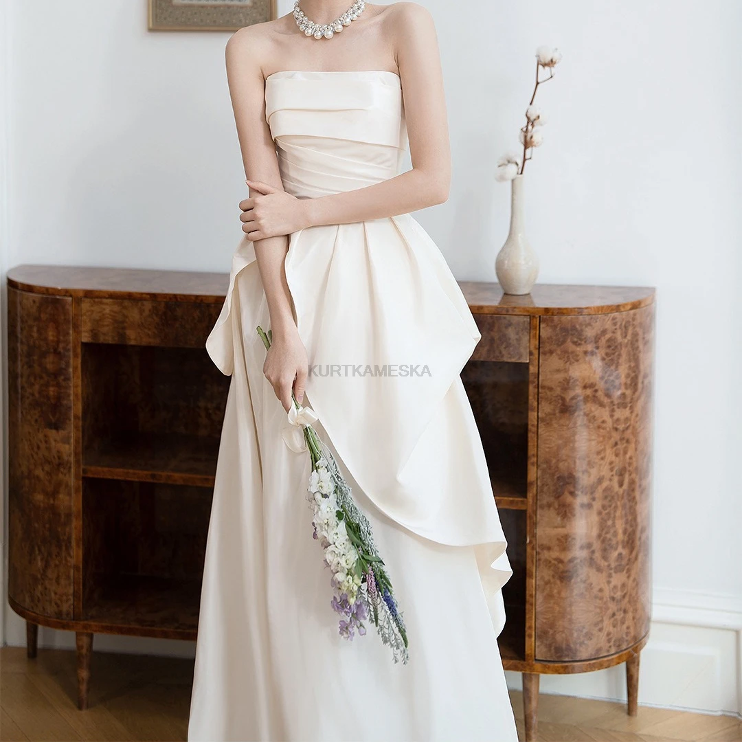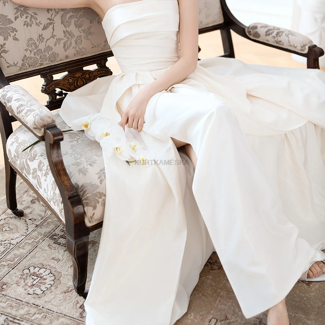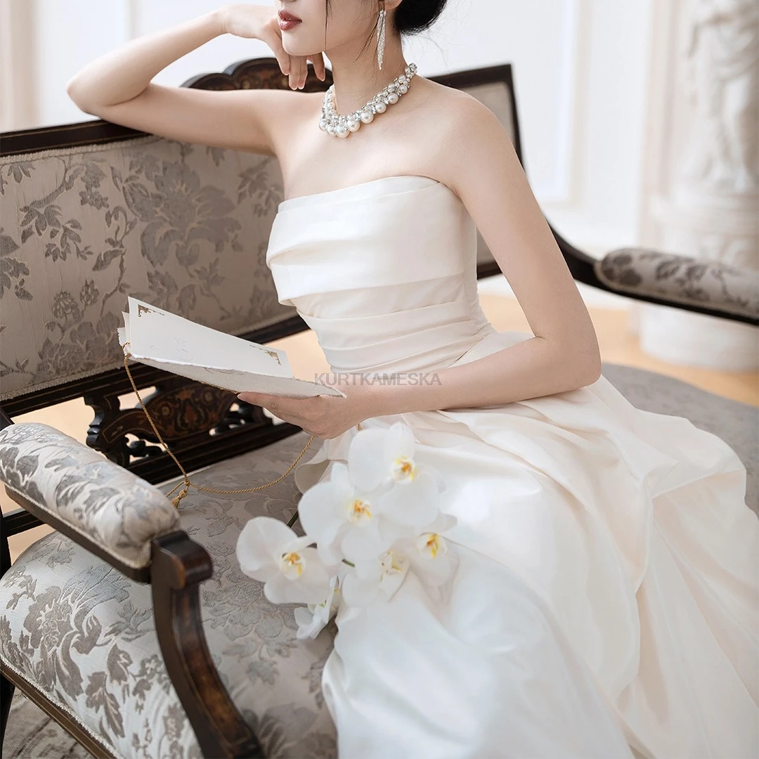 量身打造,展現自然身形 採用親膚的緞面布料(Satin),搭配簡約的平口露背與後綁帶設計,不僅修飾腰線,更增添美背視覺重點。這款禮服強調移動輕盈、穿脫方便,非常適合海外婚紗拍攝或自助婚紗攝影。