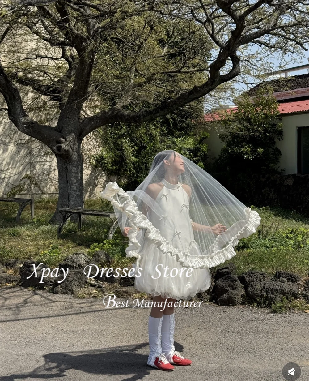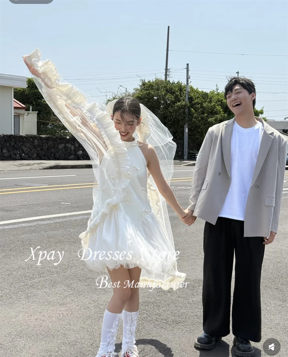 想要在登記當天擁有電影般的俏皮感嗎? 這款短婚紗採用韓系極簡設計,經典的掛脖剪裁搭配背部精緻蝴蝶結裝飾,展現靈動優雅的氣息。膝上的短裙長度(Mini Length)讓妳在移動時完全不受拘束,無論是戶政登記、海外婚禮派對,或是婚後回禮宴客,都能穿出獨特的個人品味。