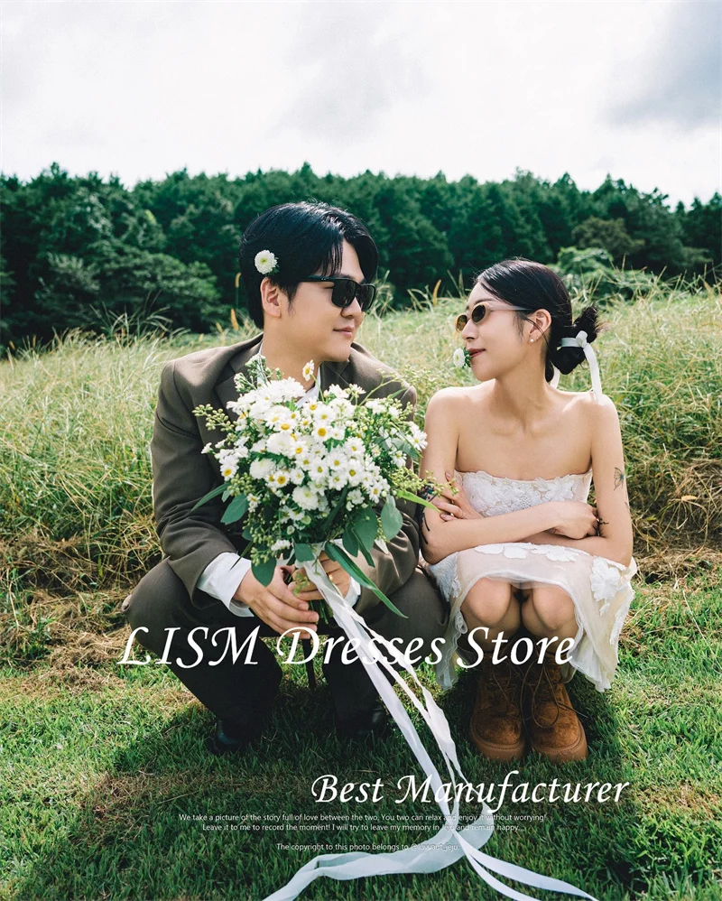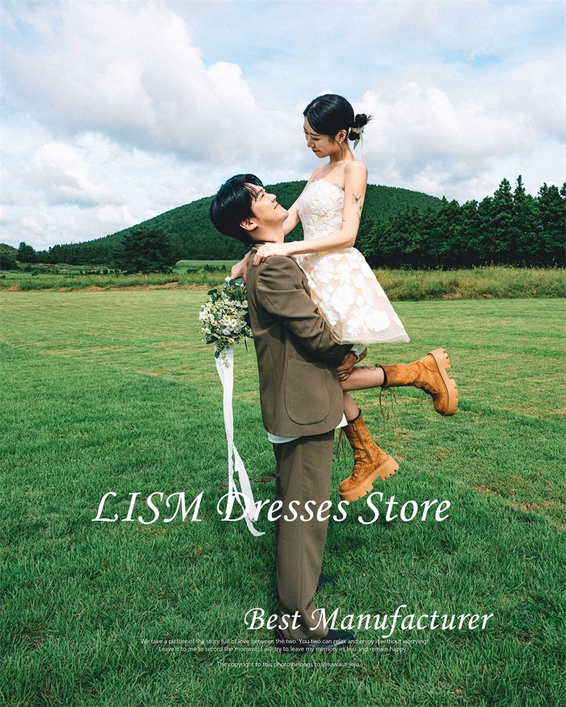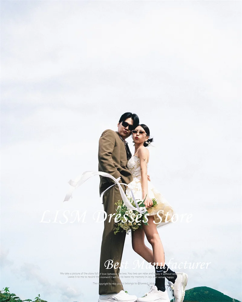 無肩帶設計修飾頸部線條,短裙長度特別適合花園婚禮、登記儀式與海外拍攝使用。