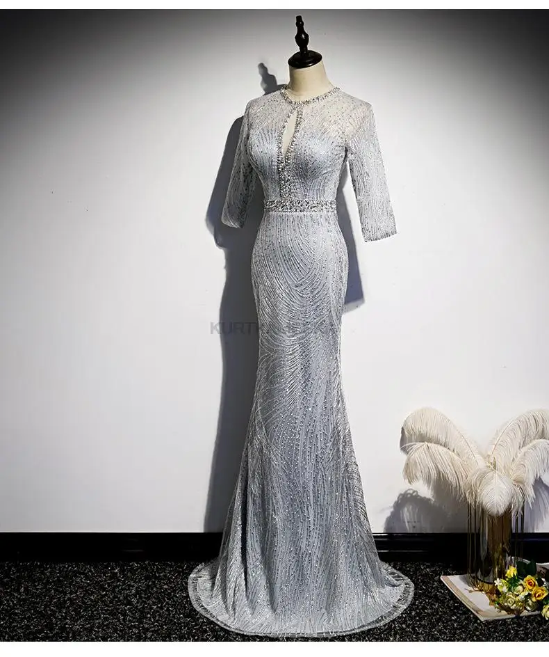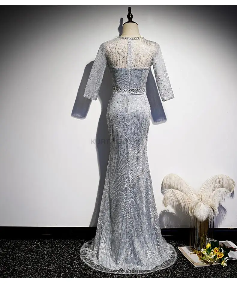 這款銀色亮片魚尾禮服,為追求極致儀式感的您提供了完美解法。它結合了長袖的典雅與長裙落地的隆重感,讓您在進場、送客或正式晚宴中,每一步都光彩奪目。