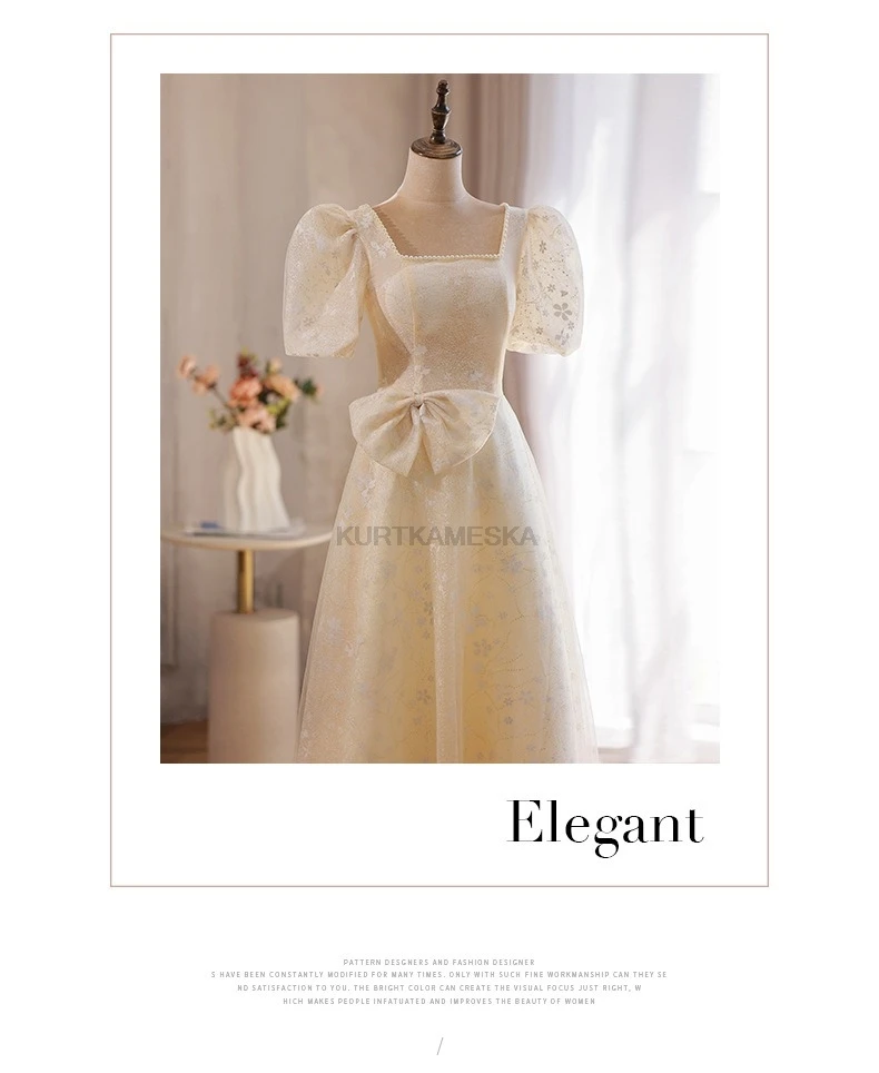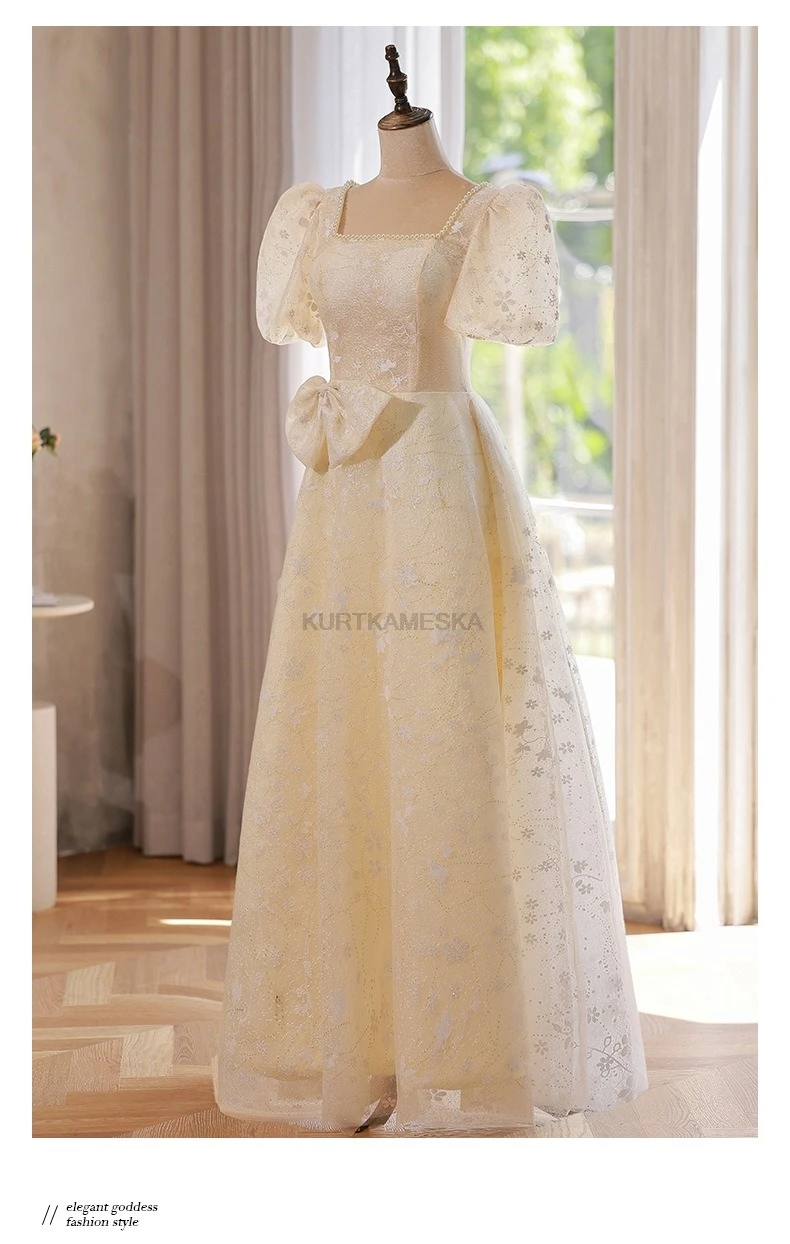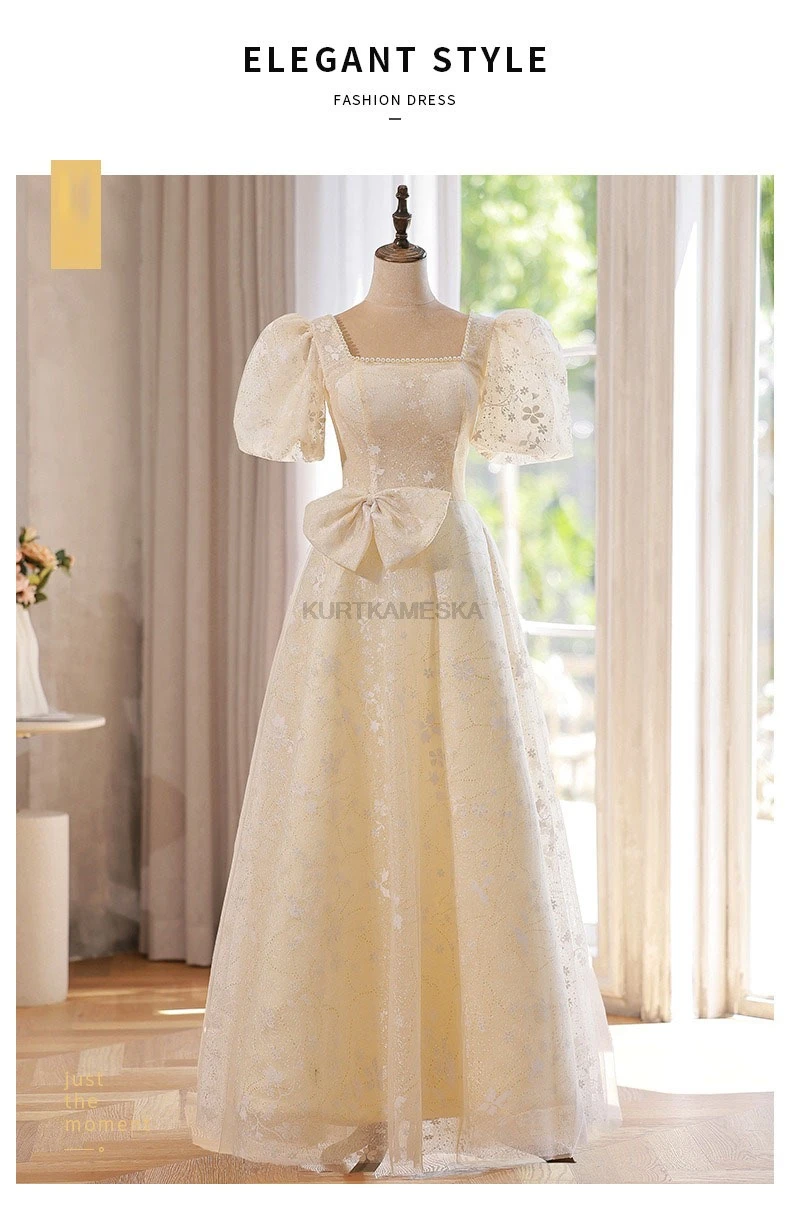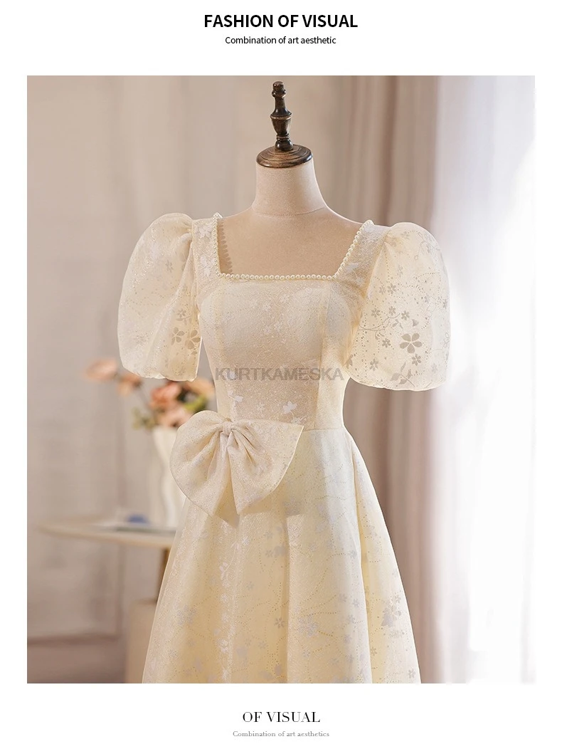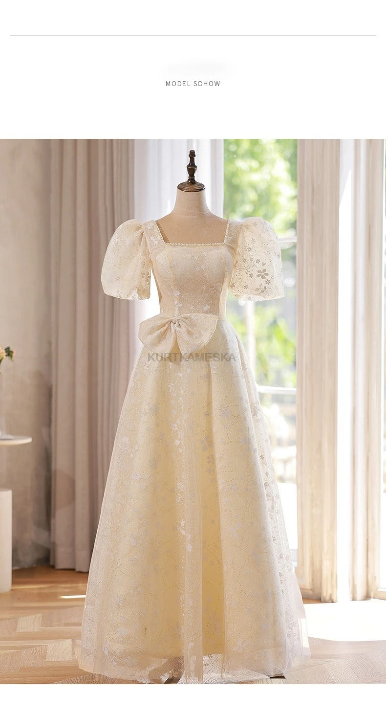 WeddLin 推出這款香檳色方領輕婚紗,以簡約的韓系風格為核心,捨棄繁冗重量。其輕便的 A-Line 剪裁與腳踝長度設計,讓妳在戶外拍攝、登機旅行或宴客走動時,都能保有俐落與自在感。