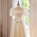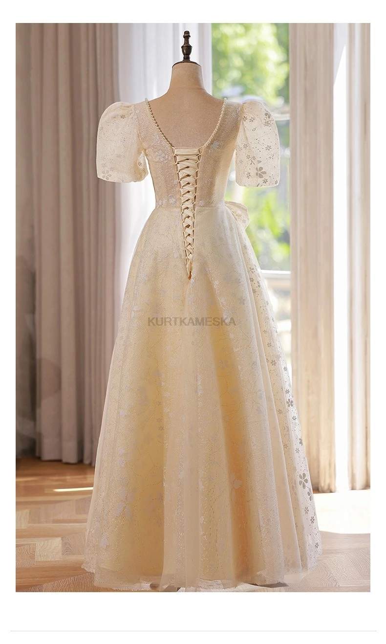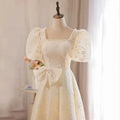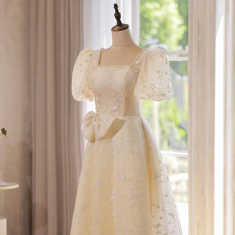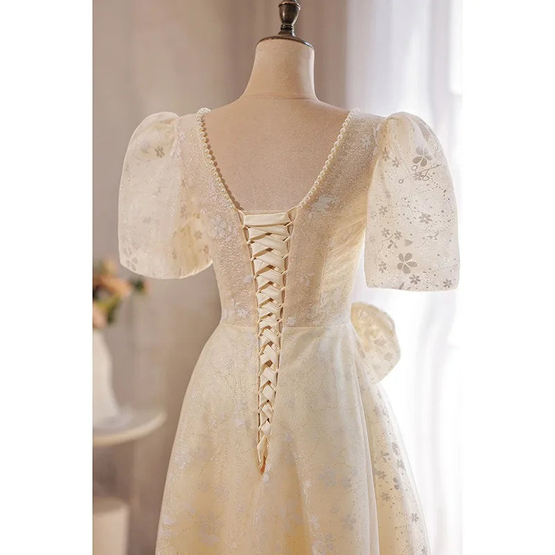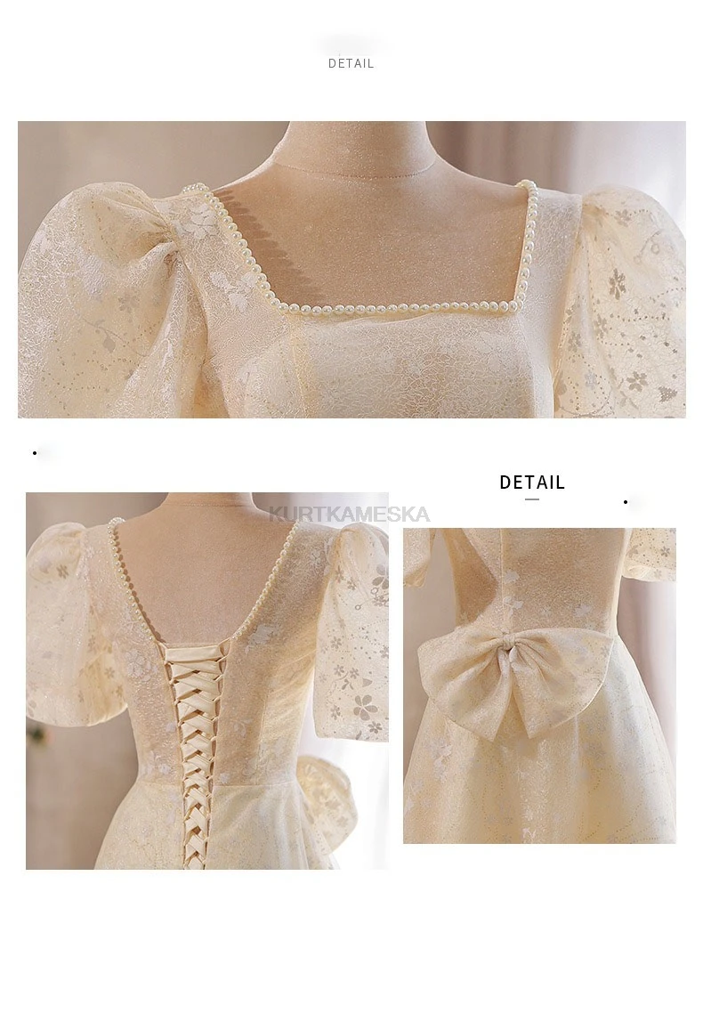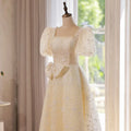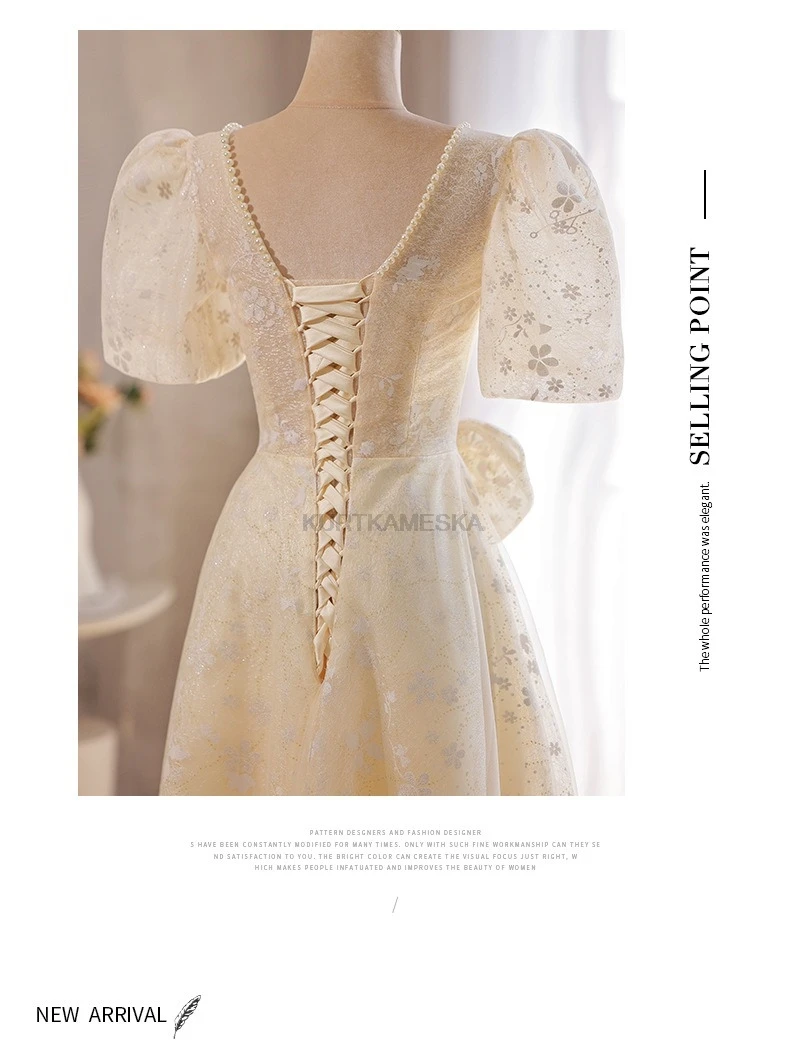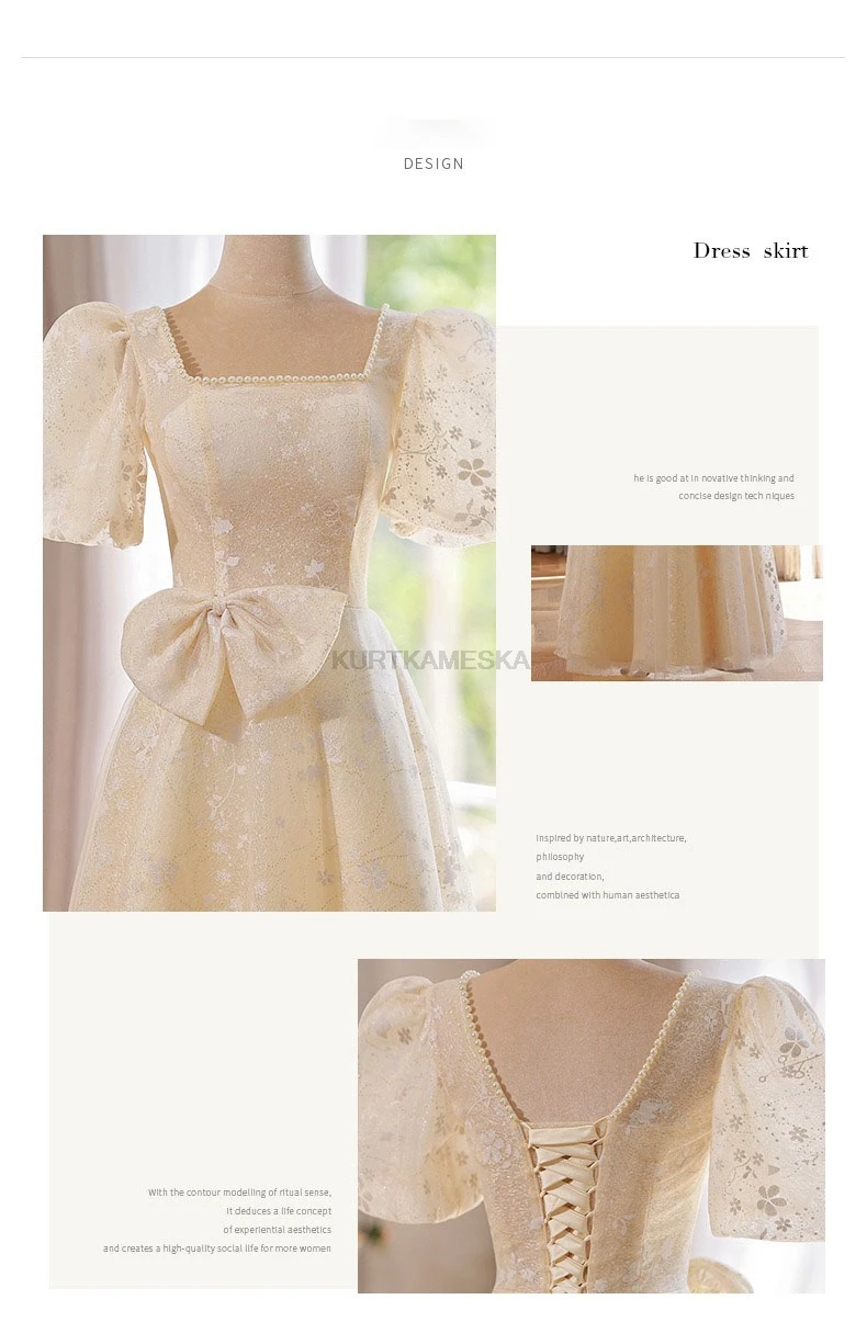 WeddLin 推出這款香檳色方領輕婚紗,以簡約的韓系風格為核心,捨棄繁冗重量。其輕便的 A-Line 剪裁與腳踝長度設計,讓妳在戶外拍攝、登機旅行或宴客走動時,都能保有俐落與自在感。