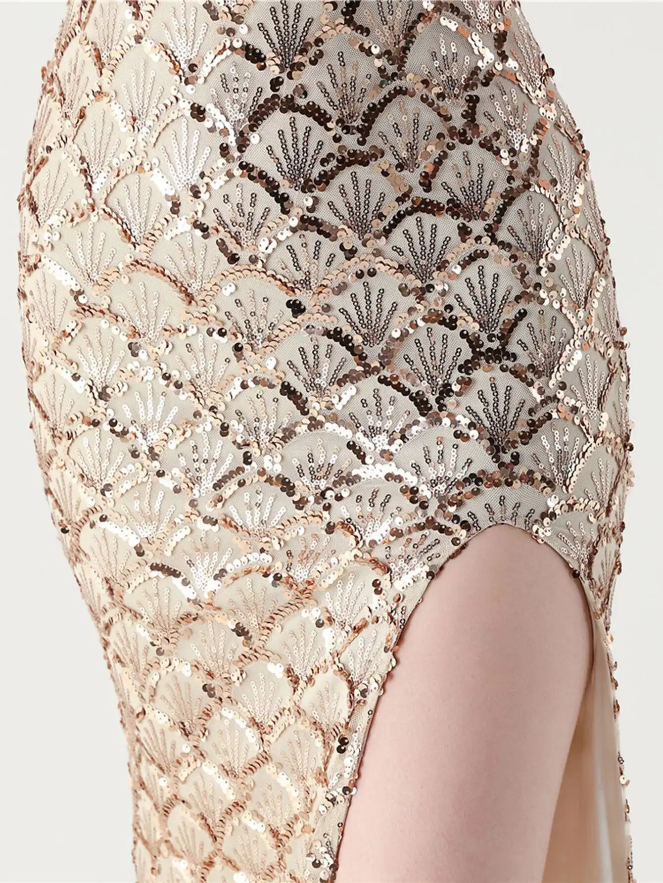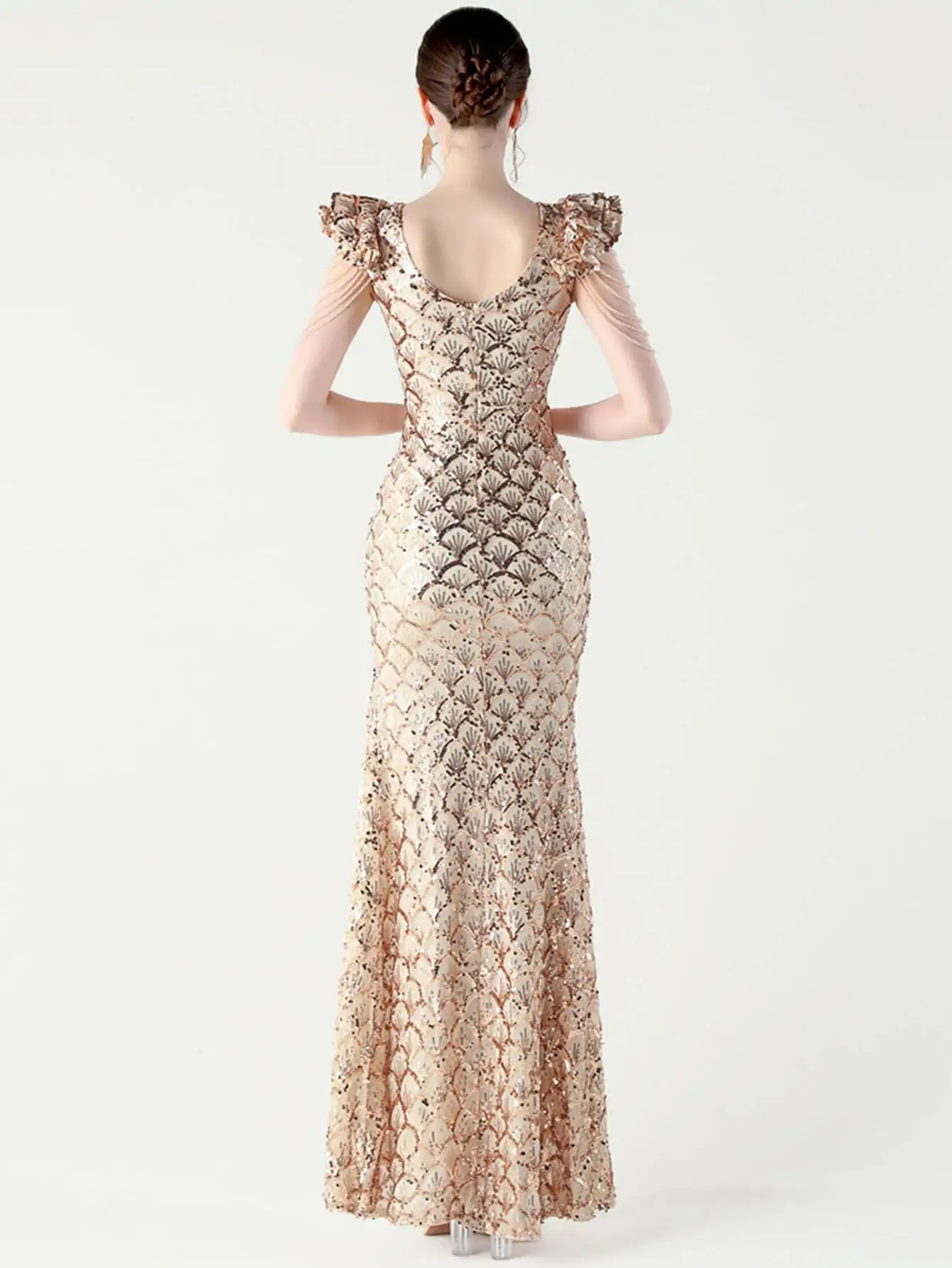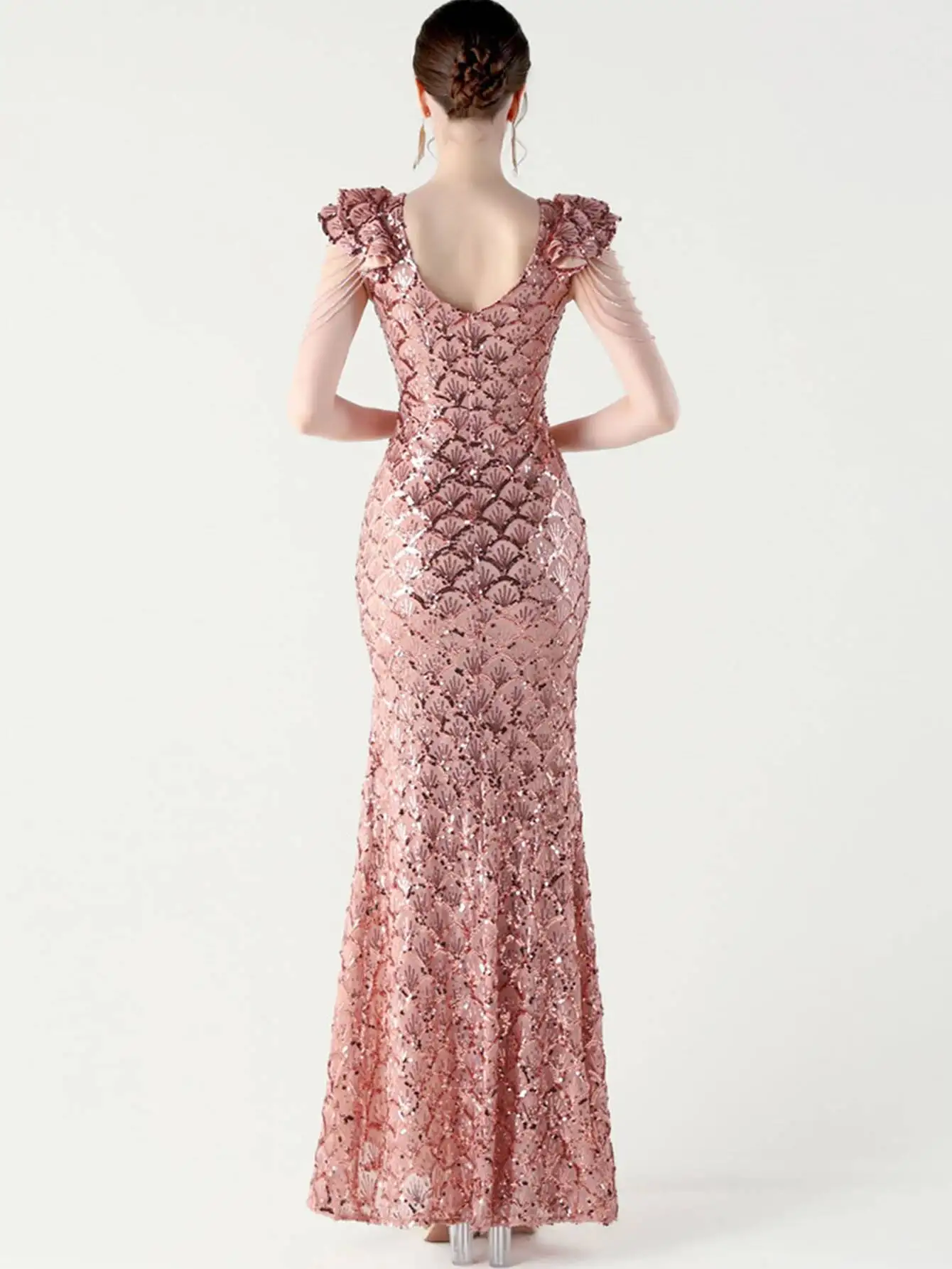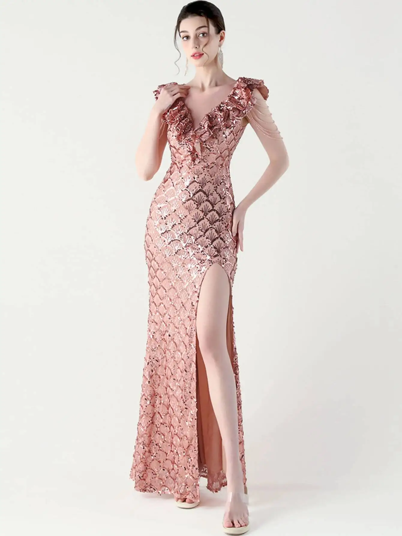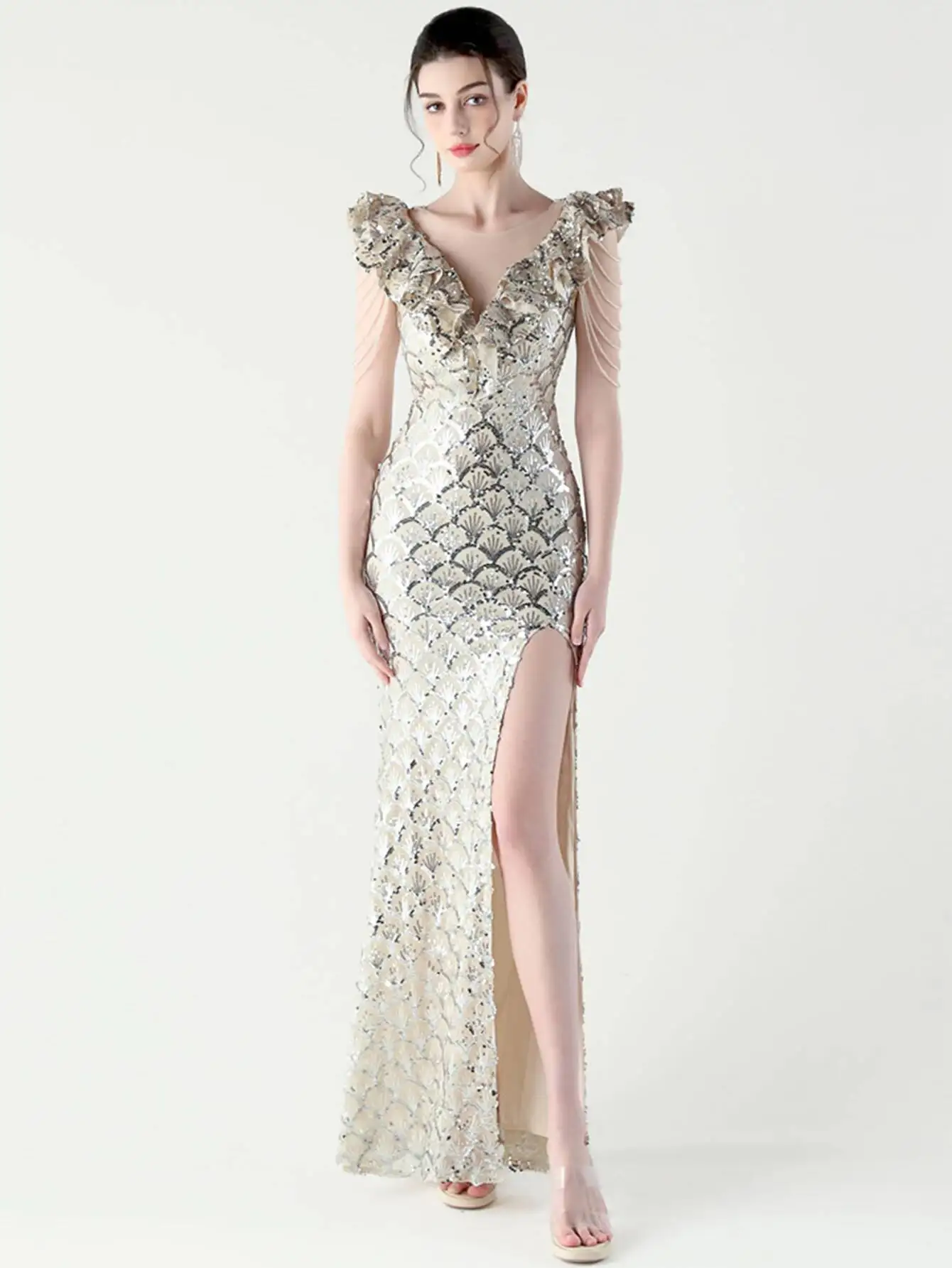 WeddLin 這款亮片魚尾晚禮服,以簡約的線條平衡了亮片布料的光澤。深V領口與露背設計勾勒出背部與頸部的俐落感,魚尾剪裁則能自然修飾下半身線條,讓妳在走動或轉身間,都能散發自然優雅的氣息。