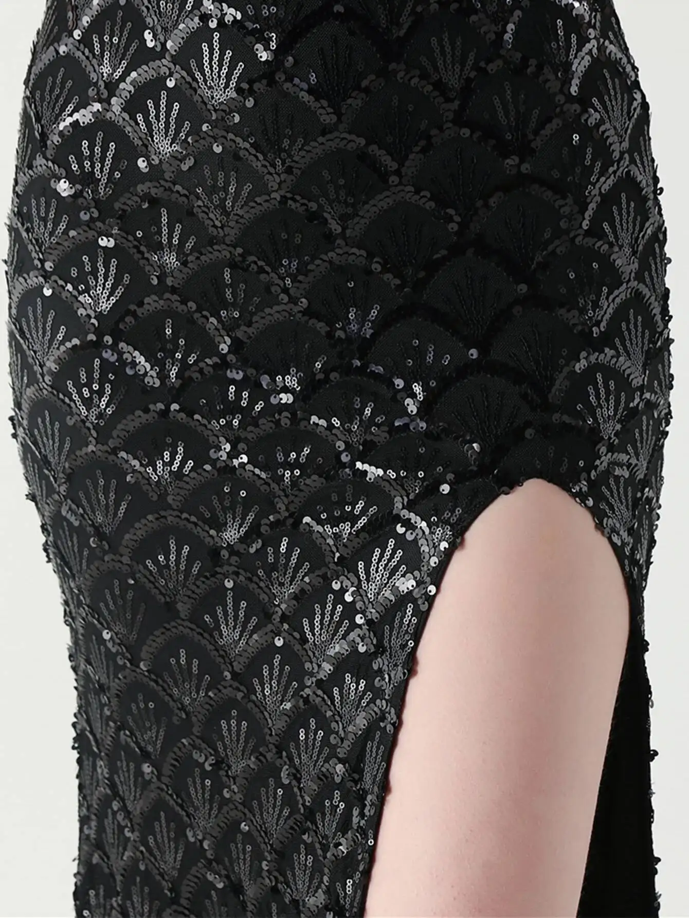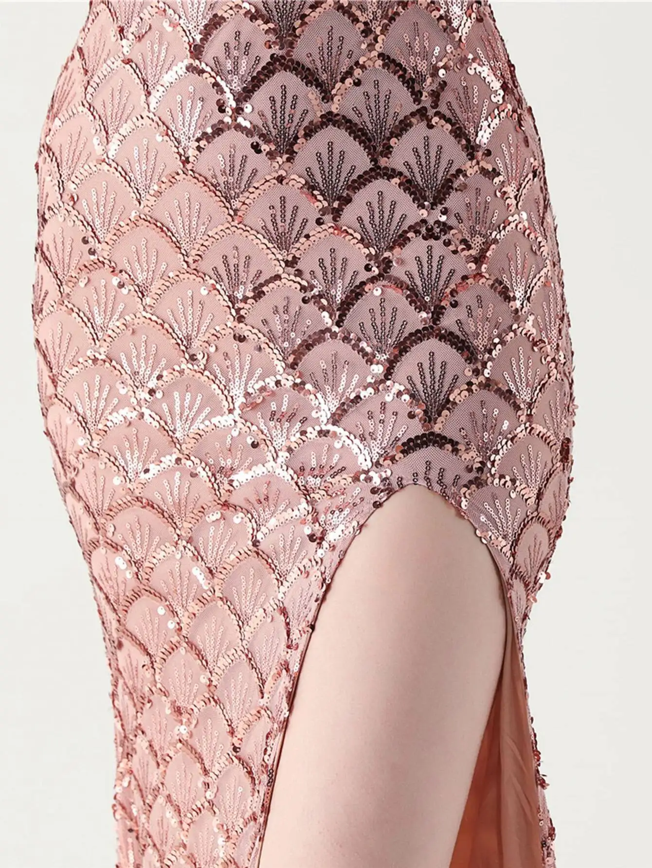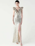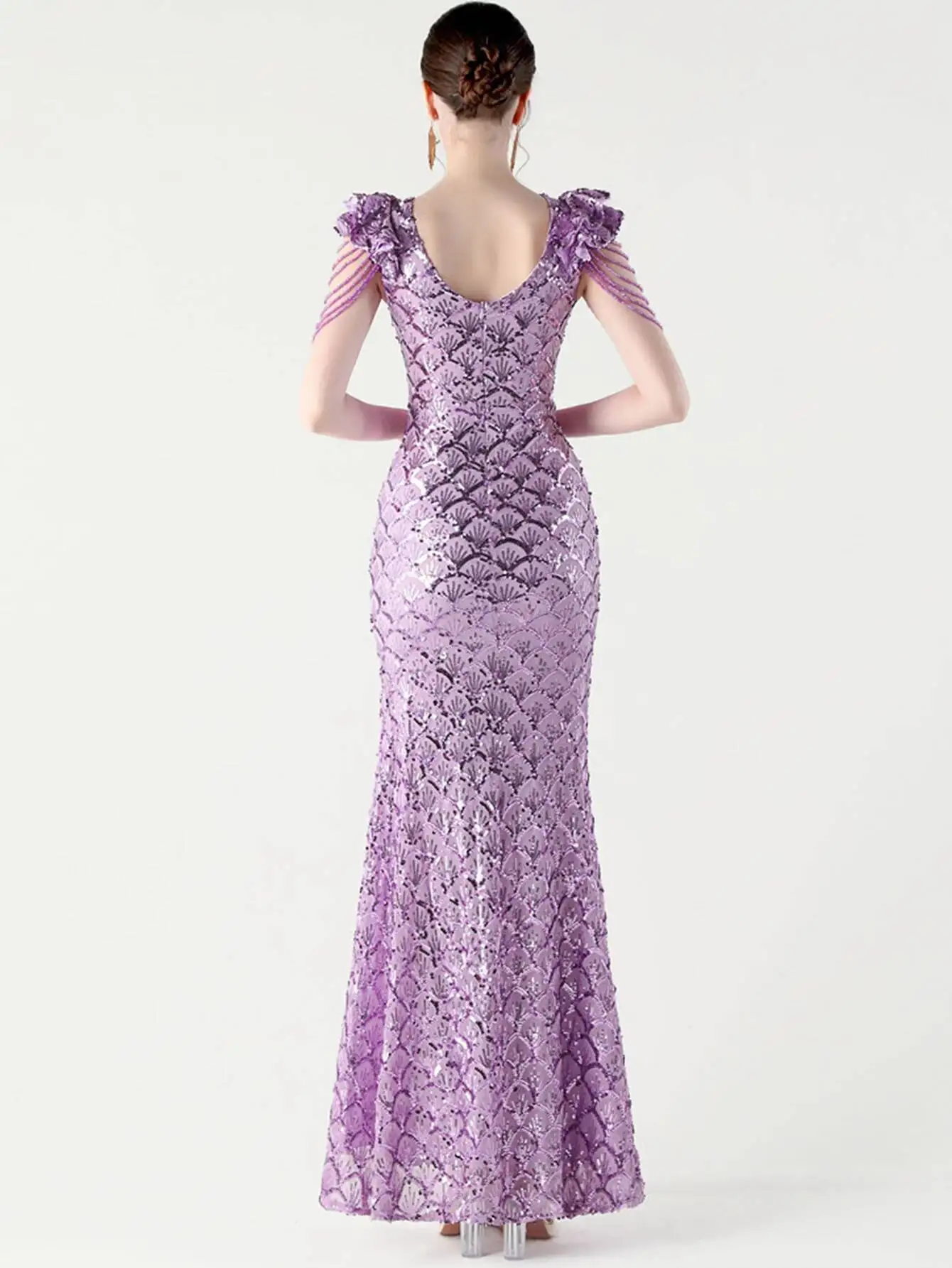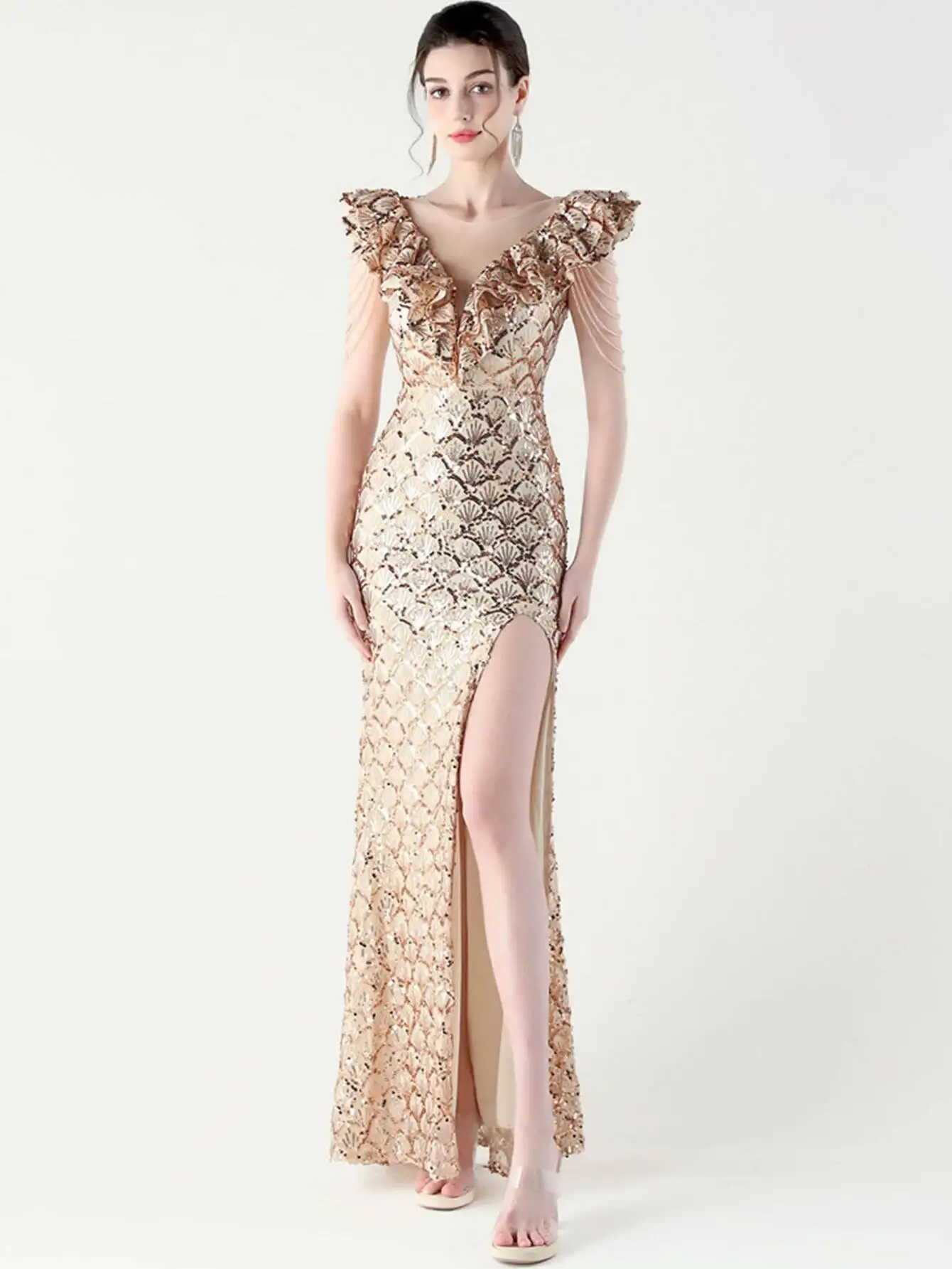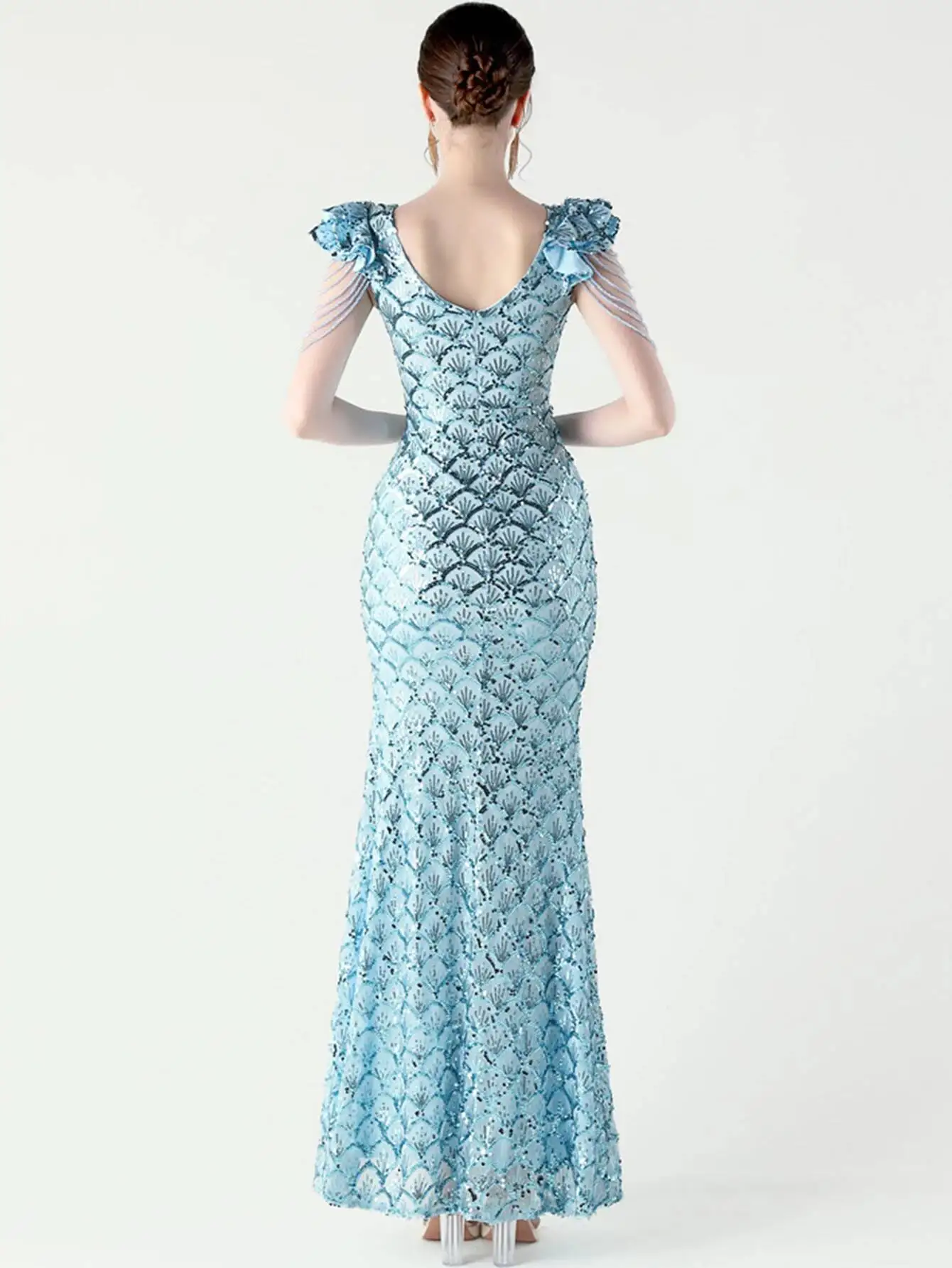 WeddLin 這款亮片魚尾晚禮服,以簡約的線條平衡了亮片布料的光澤。深V領口與露背設計勾勒出背部與頸部的俐落感,魚尾剪裁則能自然修飾下半身線條,讓妳在走動或轉身間,都能散發自然優雅的氣息。