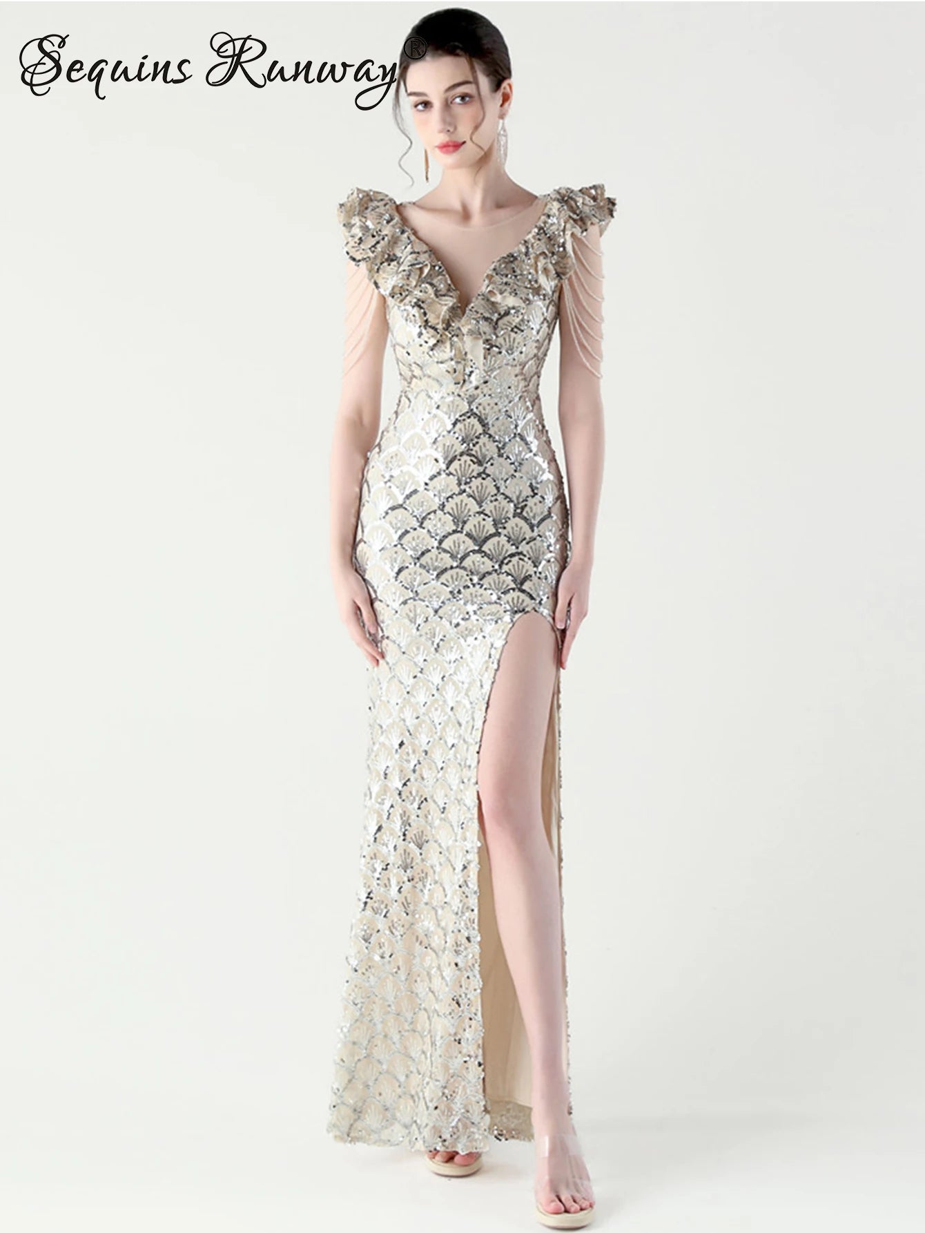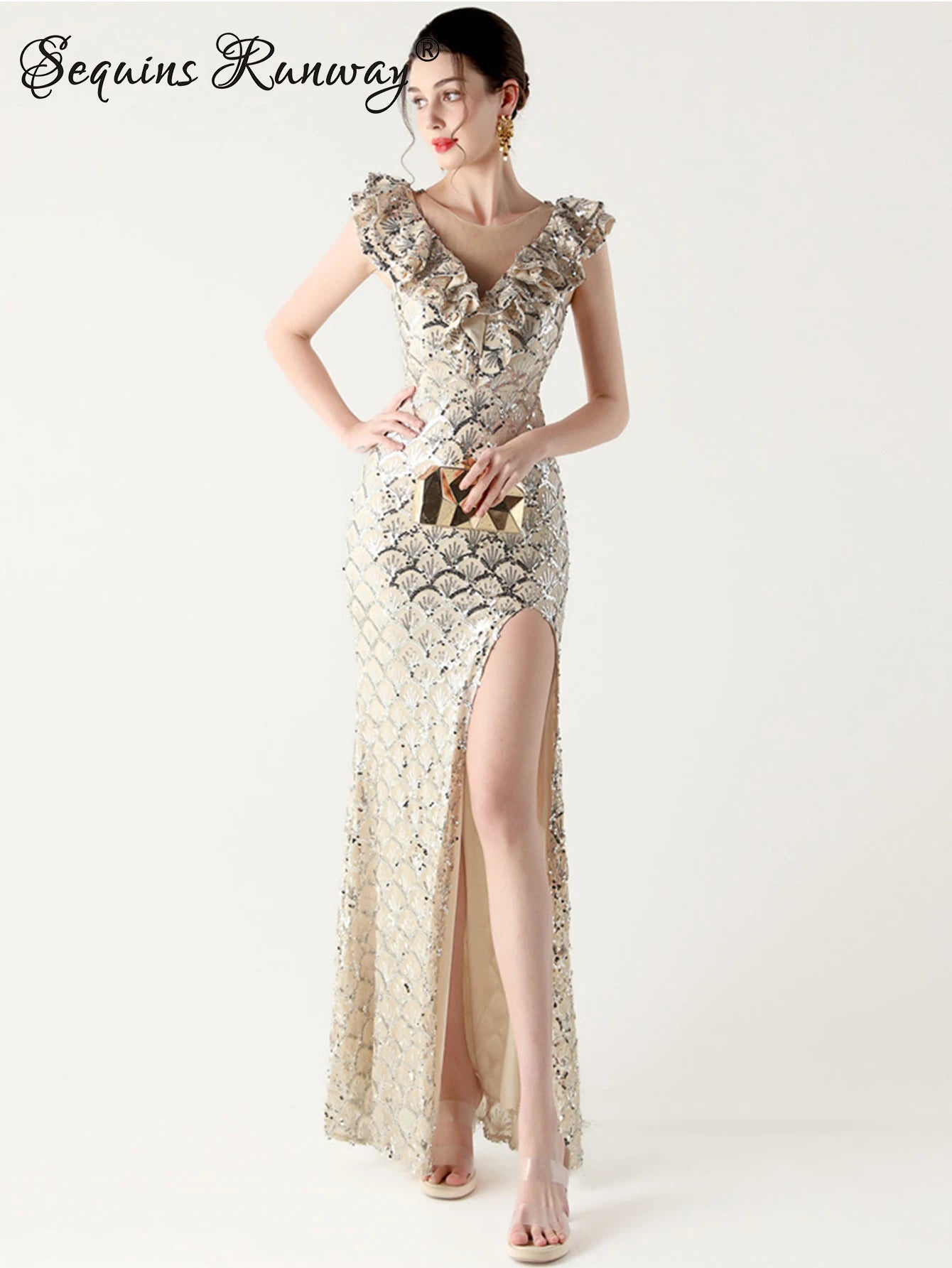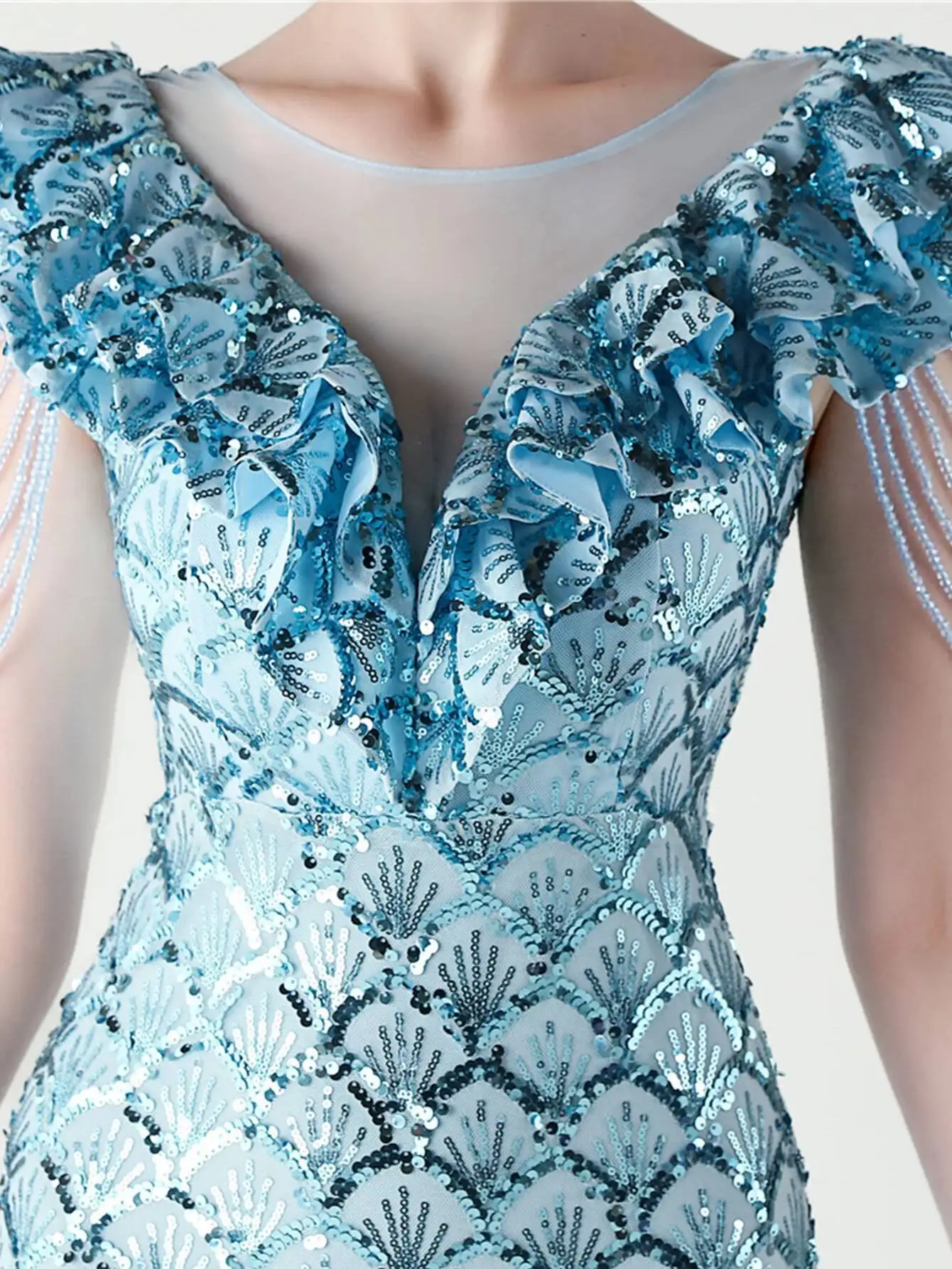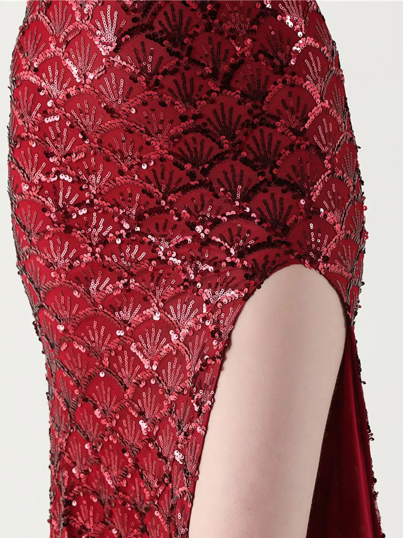 WeddLin 這款亮片魚尾晚禮服,以簡約的線條平衡了亮片布料的光澤。深V領口與露背設計勾勒出背部與頸部的俐落感,魚尾剪裁則能自然修飾下半身線條,讓妳在走動或轉身間,都能散發自然優雅的氣息。