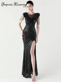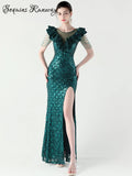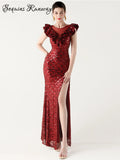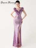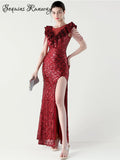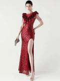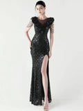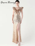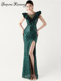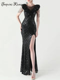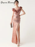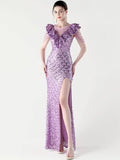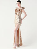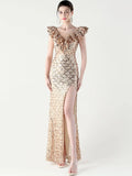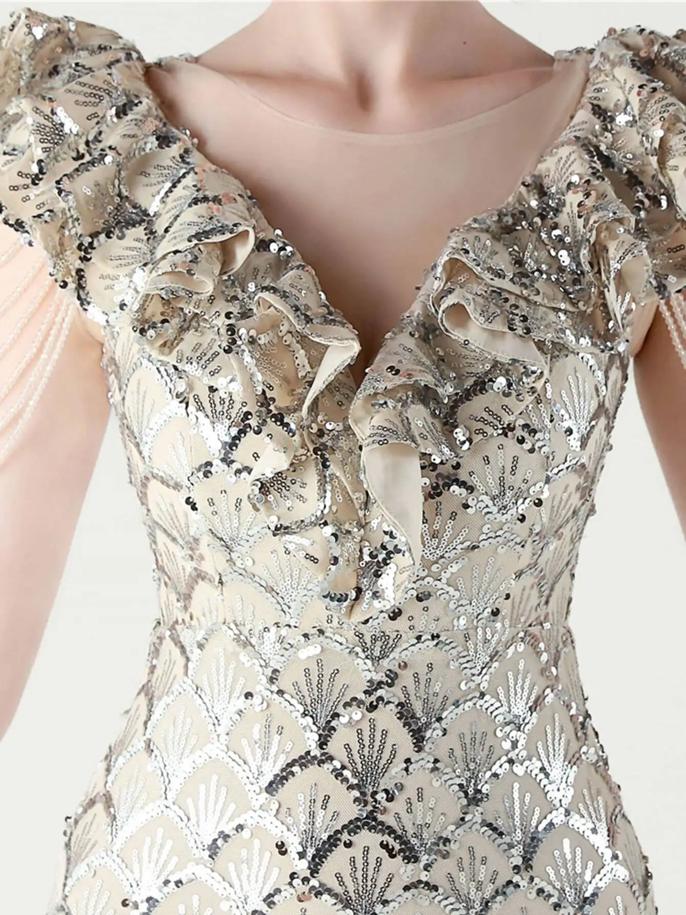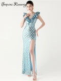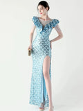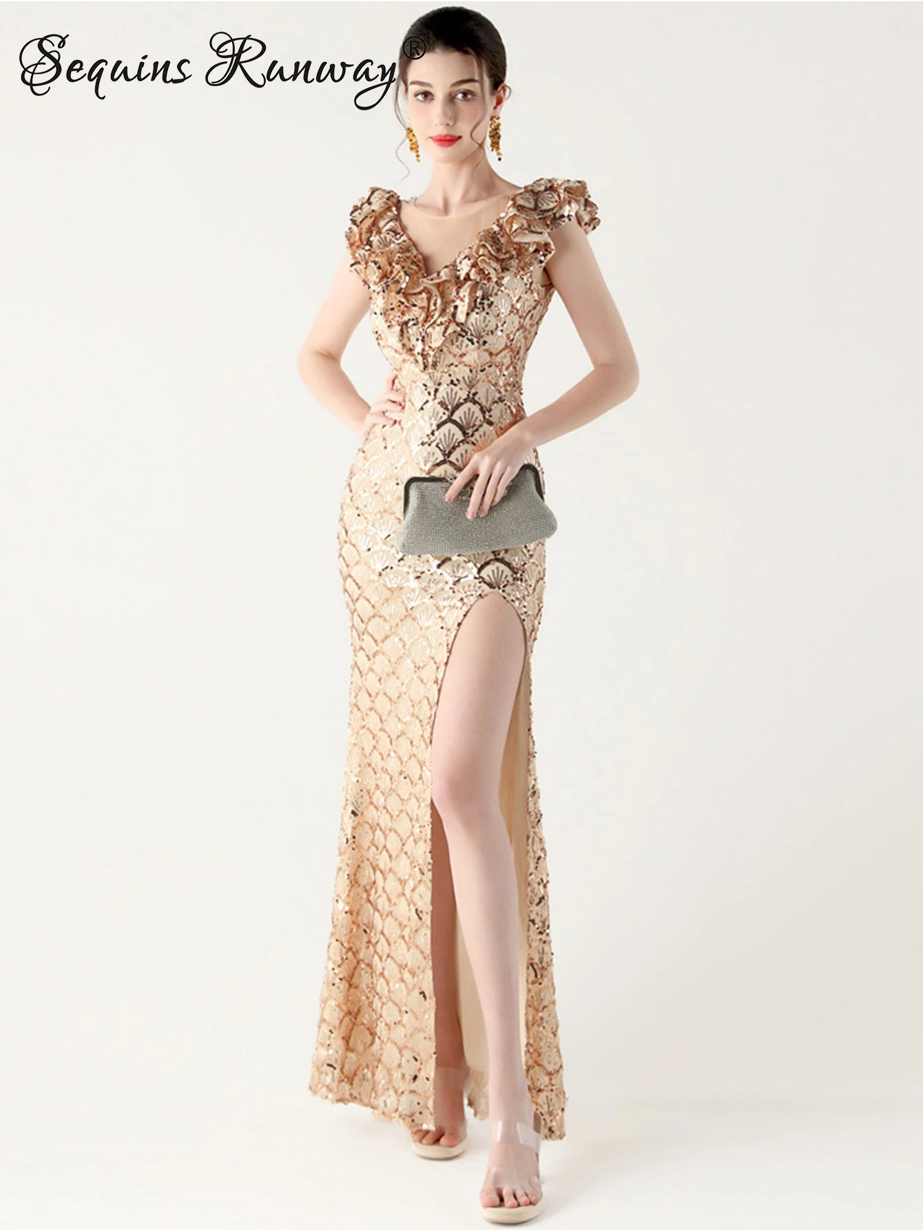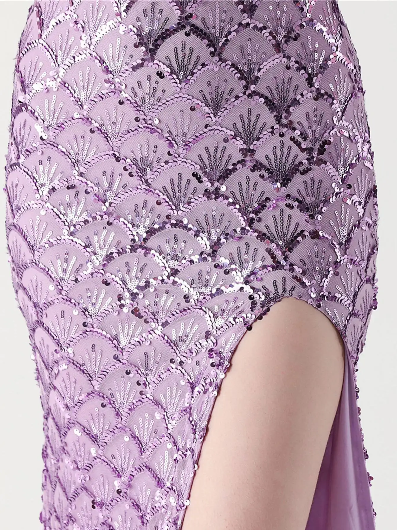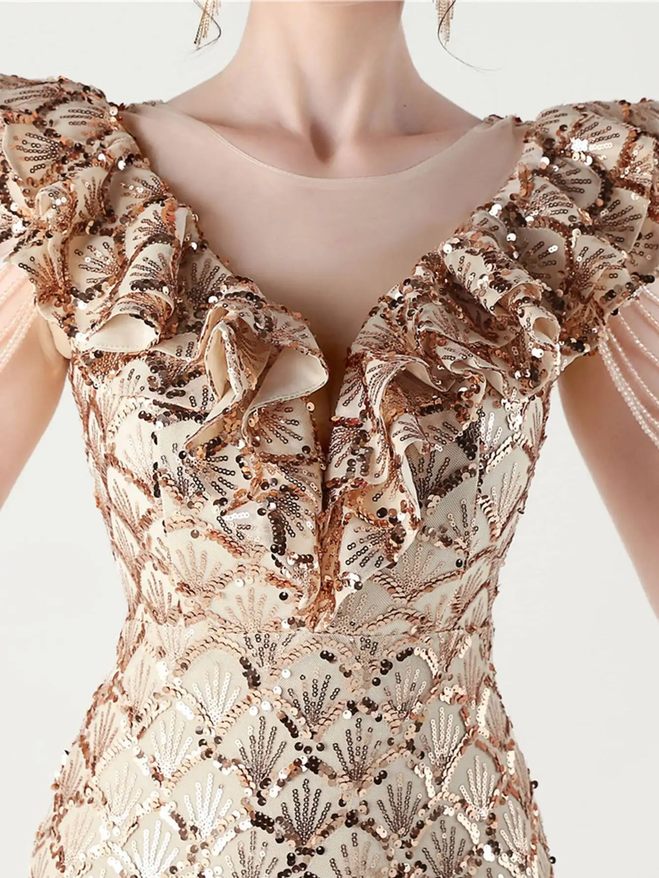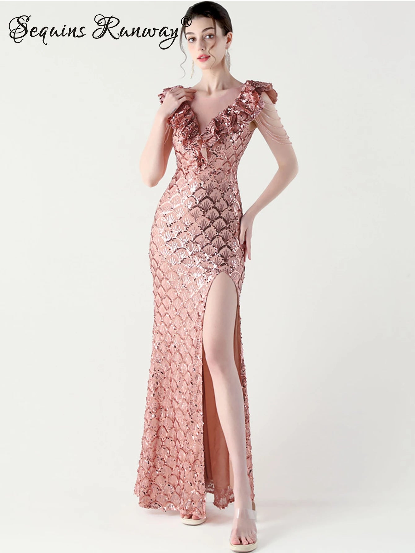 WeddLin 這款亮片魚尾晚禮服,以簡約的線條平衡了亮片布料的光澤。深V領口與露背設計勾勒出背部與頸部的俐落感,魚尾剪裁則能自然修飾下半身線條,讓妳在走動或轉身間,都能散發自然優雅的氣息。